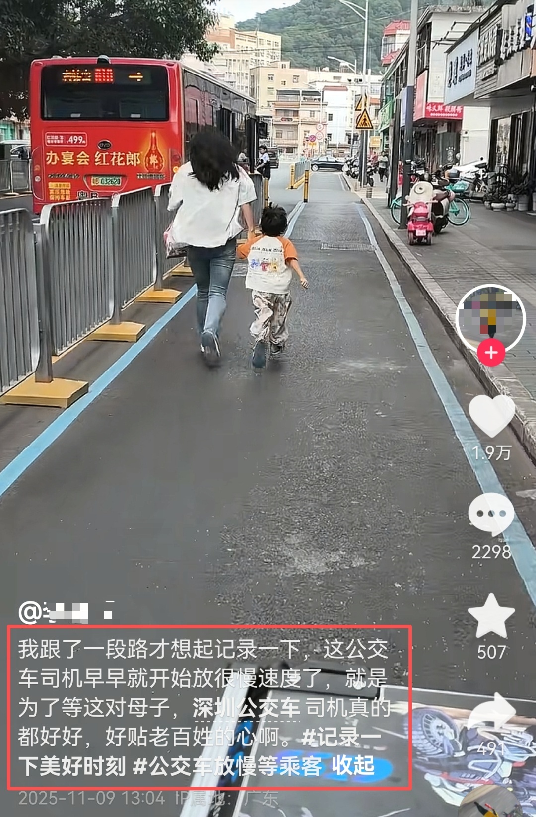 不过,包建红口中的这个“很普通的举动”被路过的热心网友拍摄记录下来,上传到短视频平台上,并配文:“我跟了一段路才想起记录一下,这公交车司机早早就开始放很慢速度了,就是为了等这对母子,深圳公交车司机真的都好好,好贴老百姓的心啊。”这段由旁观者发出的感叹迅速引发广大网友的情感共鸣,纷纷为深圳公交司机点赞。