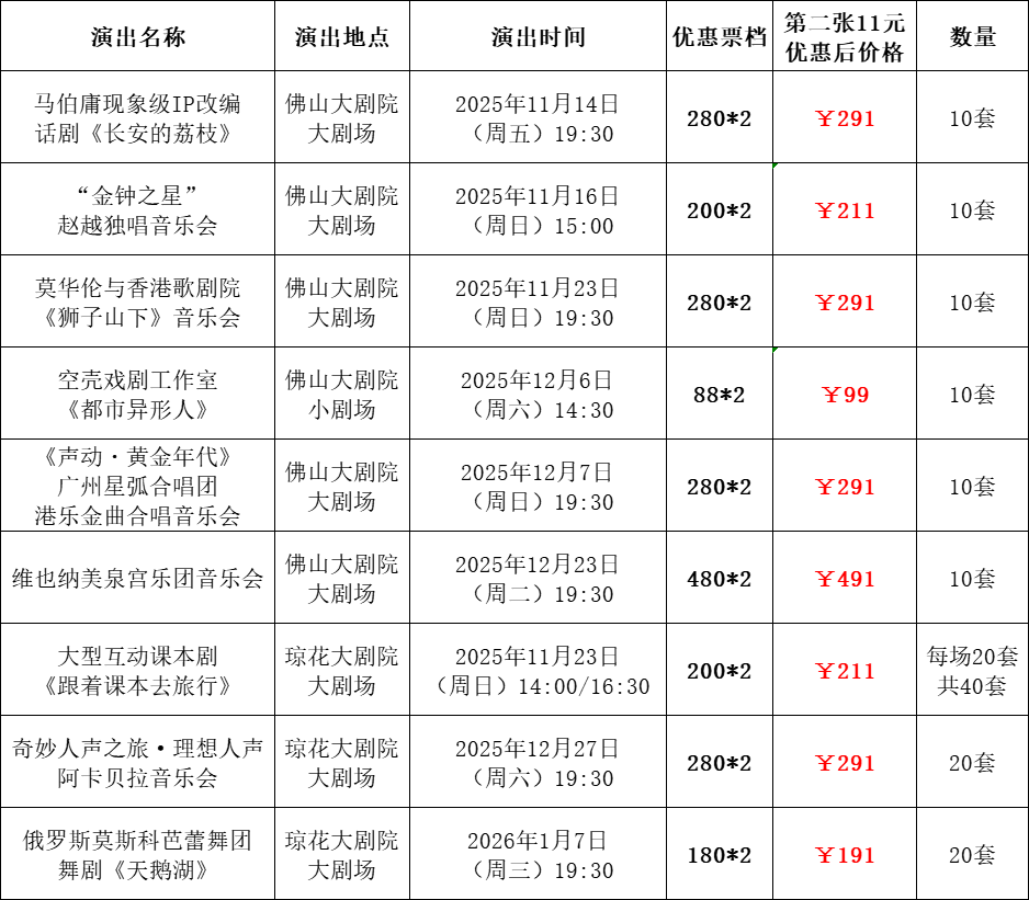 ★仅限佛山大剧院微信端官网购买,且不与其他优惠同时享受,活动购票不支持选座,购票成功次日后可凭订单二维码到自助取票机扫码换取纸质票;