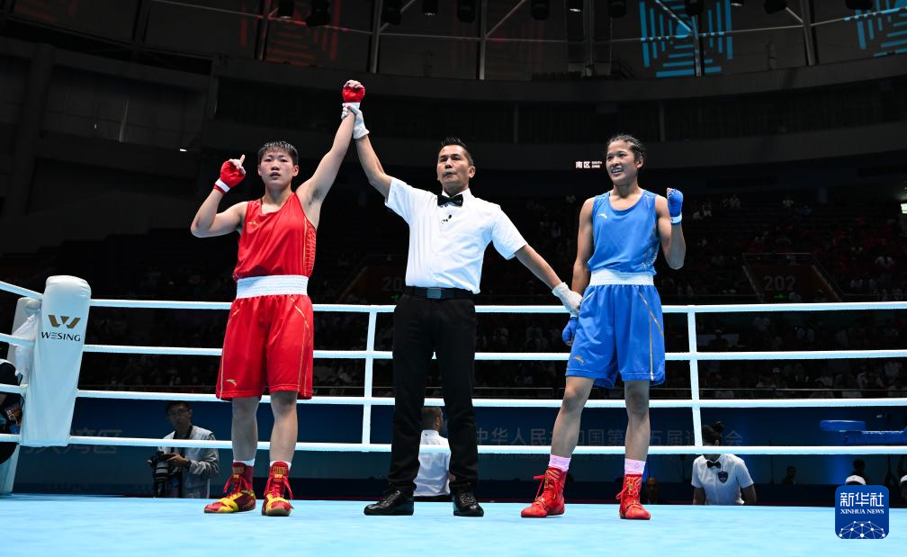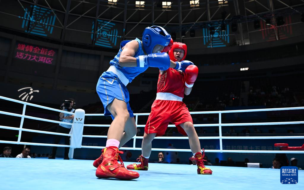 当日,在广东深圳进行的第十五届全国运动会拳击女子54公斤级半决赛中,内蒙古队选手赵轩战胜辽宁队选手李振艳,晋级决赛。