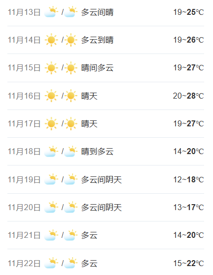 广东省气象台预计,未来几天广东天气平稳,11月13日,东部市县多云间阴天,其余市县多云到晴。11月14日-15日,全省大部晴到多云。