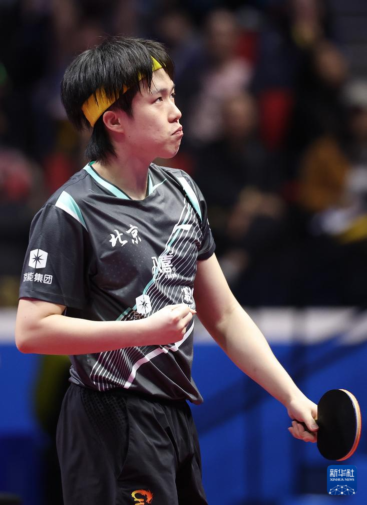 11月13日,北京队选手王楚钦在比赛中庆祝得分。