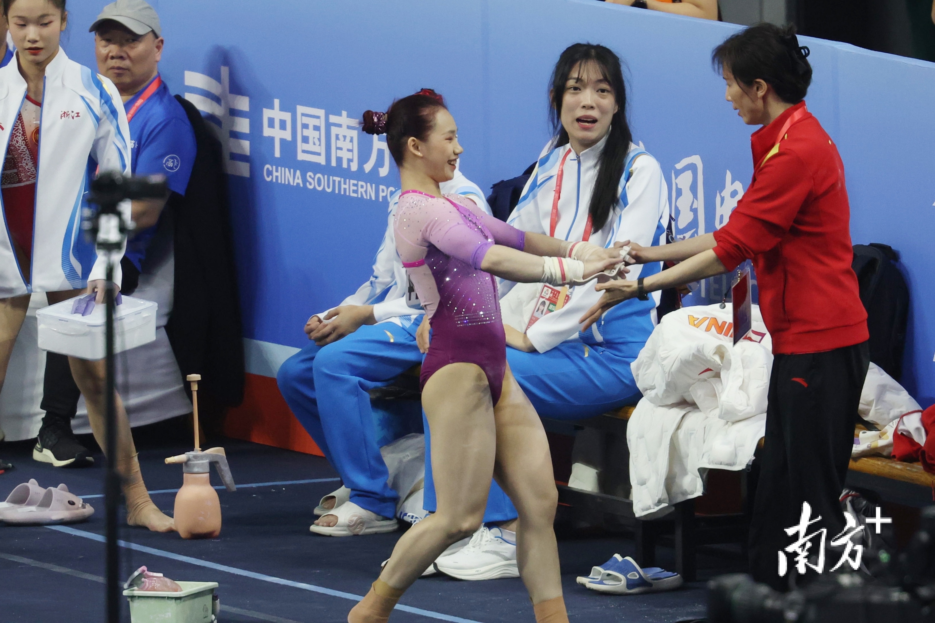 欧钰珊完成高低杠动作后接受教练欢迎。 南方+ 梁钜聪 拍摄