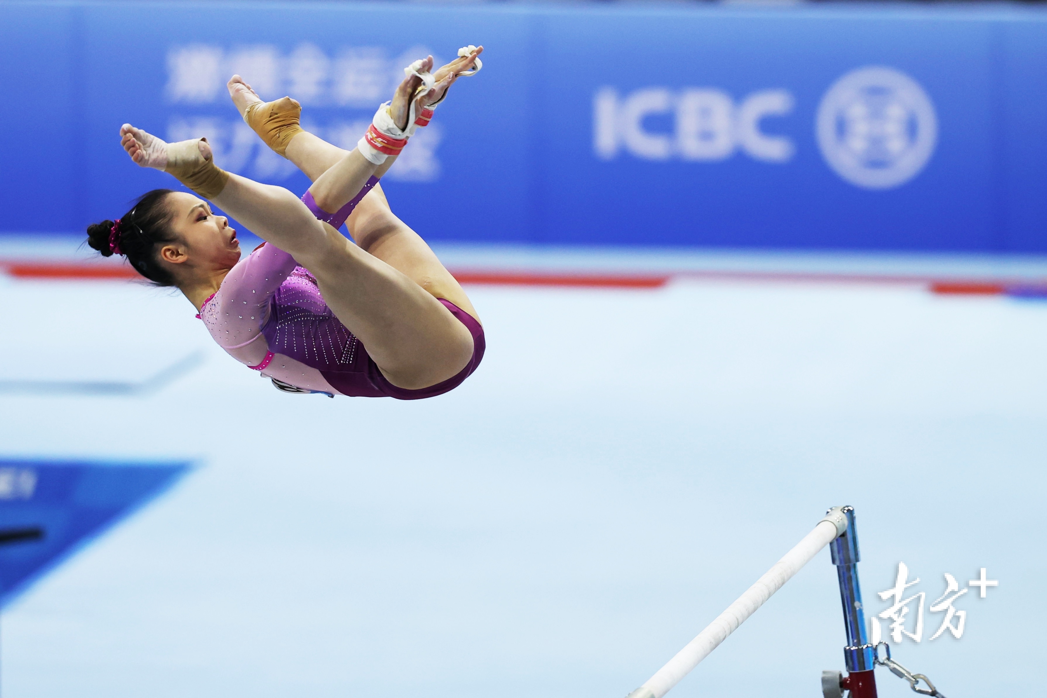 胡嘉菲在高杠上脱手跃起完成转体。 南方+ 梁钜聪 拍摄