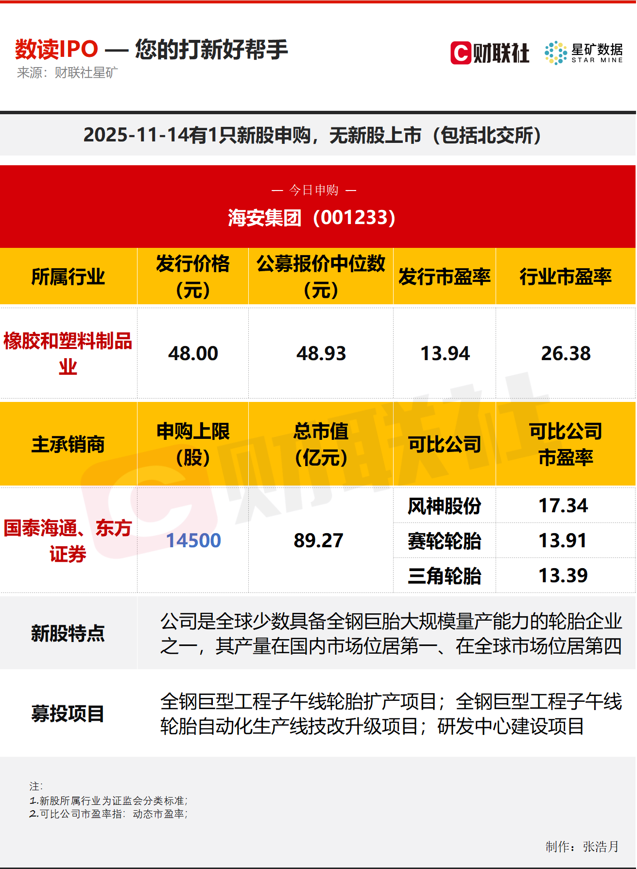 财联社11月14日讯,今日有1只新股申购,为深交所的海安集团;无新股上市。