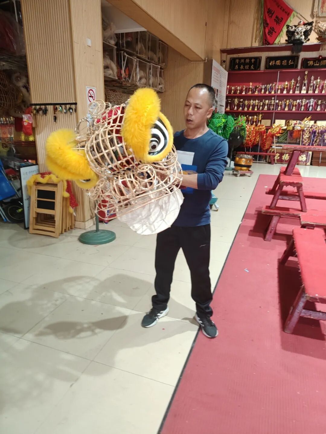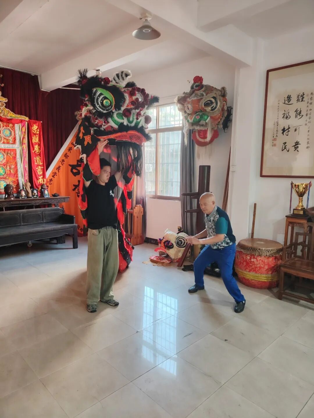 时间倒回70年代的莲塘村,当时村里的醒狮氛围就极为深厚,自元代建村以来便形成了独特的文化传承体系。“咚——咚咚——”祠堂里传来的鼓声,像一只无形的手,牵引着5岁的陈汝安循声而去。 透过祠堂大门的缝隙,他看见老前辈们正在练习三星狮。红面关公狮威风凛凛,一个腾跃,狮头上的铜铃叮当作响。那一刻,小男孩的眼睛亮了起来。 “那时候没有手机,没有电视,祠堂的鼓乐就是最好的娱乐。”陈汝安回忆道“老前辈看我对鼓点敏感,就让我跟着学。” 谁能想到,这一学就是一辈子。 在前辈们的耳濡目染下,到了1986年,陈汝安正式拜师陈仕黎学习舞狮。第一次举起狮头的时刻,陈汝安仍记忆犹新。 “传统的三星狮头有10多斤重,我那时才十多岁,瘦得像根竹竿。”他比划着,“刚把狮头举起来,整个人就晃悠了。六年级的孩子,哪扛得住这么重的家伙?只能跟着师兄们瞎玩。” 陈汝安展示狮头。 他从扎狮头开始学起,竹篾在手中弯曲成恰到好处的弧度,如同命运本身的形状。陈汝安说,做狮头就像做人,骨架要正,裱纸要匀,上色要活。 后来,在陈仕黎的精心指导下,陈汝安练得一身扎实的南国醒狮基本功,包括“武林规矩”“采青”(有桥青、盘青、凳青、高青等多种套路)和“吐红”等,陈汝安还自学了高桩狮,增加了醒狮的观赏性和竞技性。 佛山市龙狮运动协会夏志成收藏的《红狮简谱》显示,三星狮的表演有一定讲究,既有舞台的布置方式,也有对醒狮形态的要求,更有一组由58个招式组成的套路。这就对舞狮者训练的扎实程度,提出了很高的要求。 舞狮最难的不在于舞步,真正的考验从基本功开始。马步一扎就是半个小时,汗水顺着脸颊滴落,在青石板上晕开深色的印记。“起来时腿抖得厉害,连去厕所都蹲不下去。”陈汝安笑着说。 彼时,学徒需从武术基本功练起:扎马步半小时、徒手训练、慢步稳形......“师傅严格,练完浑身湿透,动作不到位就要重来。”陈汝安形容那段岁月“风光背后尽是艰辛”。在艰苦打磨中,狮魂渐成。 这种艰苦的顿悟,每个张槎莲塘的龙狮师傅都经历过,这些经历共同串联起莲塘醒狮的百年脉络。这个拥有700年历史的古村落,是南狮“三星狮”的重要发源地,舞狮在清末民初已十分风行,当时村内就有多支狮队。 在这份浓厚的文化氛围熏陶下,再加上自身的刻苦训练,陈汝安的醒狮技艺日益精湛,如今已经成为莲塘龙狮团团长。在村集体的支持下,陈汝安组队赴马来西亚云顶,参加“国际舞狮锦标赛”,获第七名。并多次组队参加国内外的舞狮锦标赛,屡获殊荣。 陈汝安很重视醒狮文化的传承和人才培养。这些年,陈汝安长期在莲塘龙狮训练基地执教,培养出多名优秀弟子,其中有一位叫陈满真,他在2020年12月参加“中体杯”佛山狮王争霸赛,荣获南狮传统项目第一名,被誉为“佛山狮王”。 梦想的种子是在1998年埋下的,10岁的陈满真通过学校选拔进了莲塘龙狮团。第一次看见师兄们在两米高的梅花桩上腾跃时,他热血沸腾。 “表演结束时的掌声,像雷声一样震撼。”陈满真回忆,“从那一刻起,我就下定决心,一定要成为主力狮手。” 然而,命运跟他开了个玩笑。在一次训练中,陈满真为了做一个高难度动作,腰部严重扭伤。 “医生说,不能再进行高强度训练了。”当时,家人坚决反对他继续舞狮。隔着病房的玻璃,陈汝安看见少年咬着嘴唇,倔强地不让眼泪流下来。 对于陈满真来说,醒狮不只是一种技艺,更是流淌在他血液里的记忆。在渐渐康复后,陈满真心想:暂时无法舞狮,那就学打鼓吧。舞狮是一个整体,狮头、狮尾、鼓手、锣手,缺一不可。只要能留在狮队,什么位置他都愿意。 “师傅,我想学打鼓。”他的声音很轻,却异常坚定。陈汝安看着他真挚的眼神,想起了自己当年执着苦练的场景,默默把鼓槌递到陈满真手中,开始教他击鼓。 从此,训练场上多了一个坐在板凳上练习击鼓的少年。他的鼓声从生涩到流畅,从凌乱到精准。最让人惊讶的是,他总能预判狮子的每一个动作,鼓点与狮舞完美契合。 凭借这份异人的天赋与执着的坚守,多年后,这个倔强的少年淬炼成才,毅然执起了教鞭,走上了与师傅陈汝安一样的道路。2010年,陈满真开始担任张槎中学龙狮队教练工作,至今培训过的学生超过千人,陈满真也成为了区级代表性传承人。 陈满真指导学生。 陈汝安与陈满真的师徒传承,是一段跨越时空的文化接力,恰似张槎莲塘醒狮文化的微缩史诗,在27年的传承中呈现出师徒情谊与文化使命的融合。 陈满真说:“老一辈带年轻一代,叔叔教侄子,这就是莲塘醒狮文化的传统。”