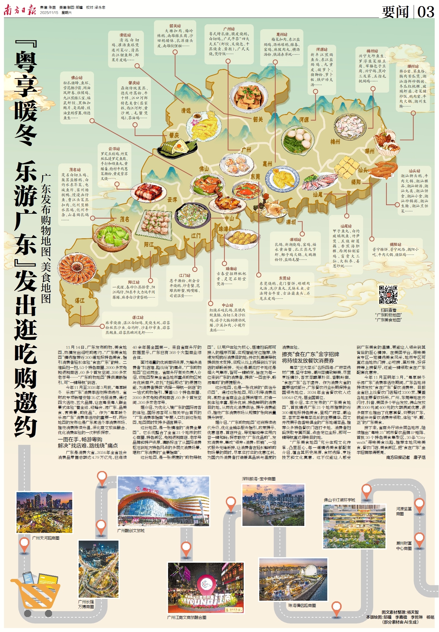 11月14日,广东发布购物、美食地图,热情发出逛吃购邀约。“广东美食地图”精选推荐近300道地标特色美食,指引消费者轻松体验“食在广东”韵味。二维码扫一扫,53个特色商圈、2000多家免税退税商店、60多个首发空间、200多家老字号……“广东购物地图”提供清晰指引,可“一键导航”到店。