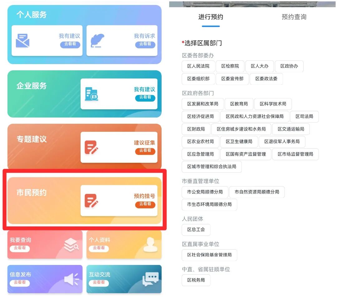 通过顺德区人民建议征集系统微信小程序,根据预约号源情况提前选择您需要对接的部门和时间,在线提交预约申请。
