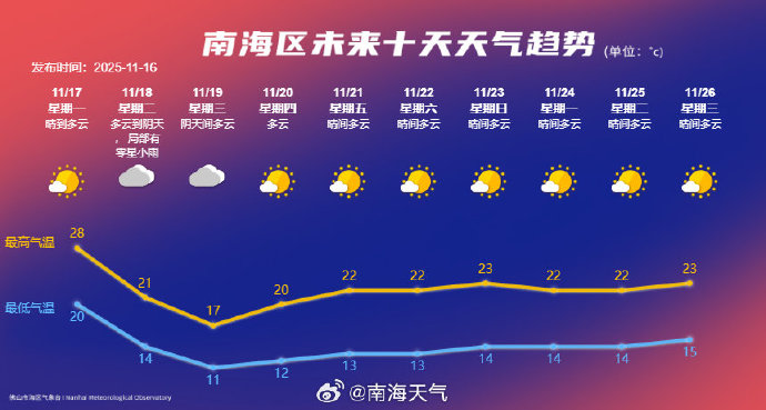 佛山市气象台预计,受强冷空气南下影响预计11月17日下午起,佛山市北风加大至4级、阵风7级左右,各区较大可能发布寒冷黄色预警信号。11月18日至20日,天气干冷气温显著下降。过程日平均气温降幅7℃-9℃,最低气温11℃左右,出现在11月19日早晨。
