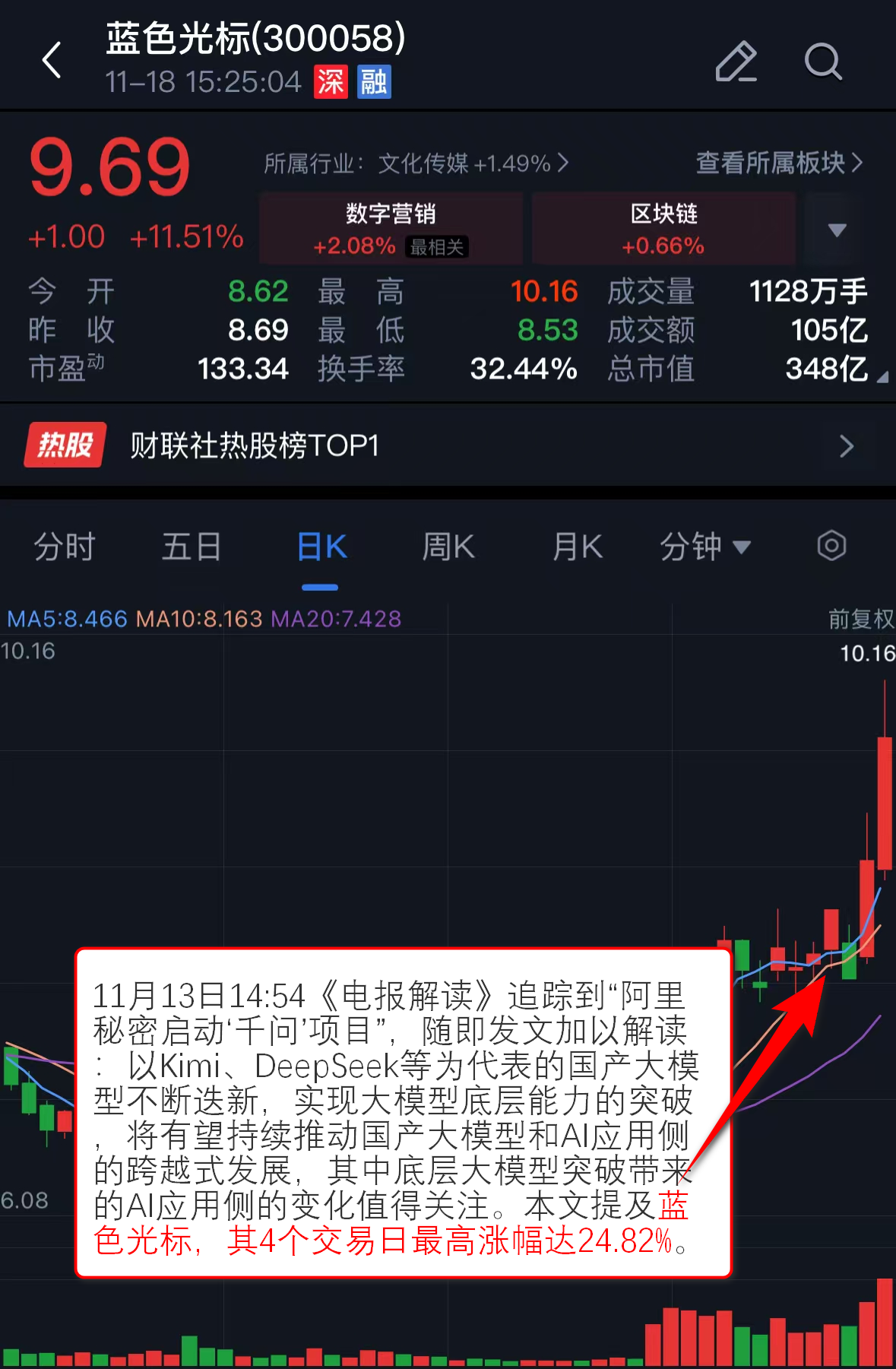11月13日14:54《电报解读》追踪到“阿里秘密启动‘千问’项目”,随即发文加以解读:以Kimi、DeepSeek等为代表的国产大模型不断迭新,实现大模型底层能力的突破,将有望持续推动国产大模型和AI应用侧的跨越式发展,其中底层大模型突破带来的AI应用侧的变化值得关注。本文提及蓝色光标,其4个交易日最高涨幅达24.82%。