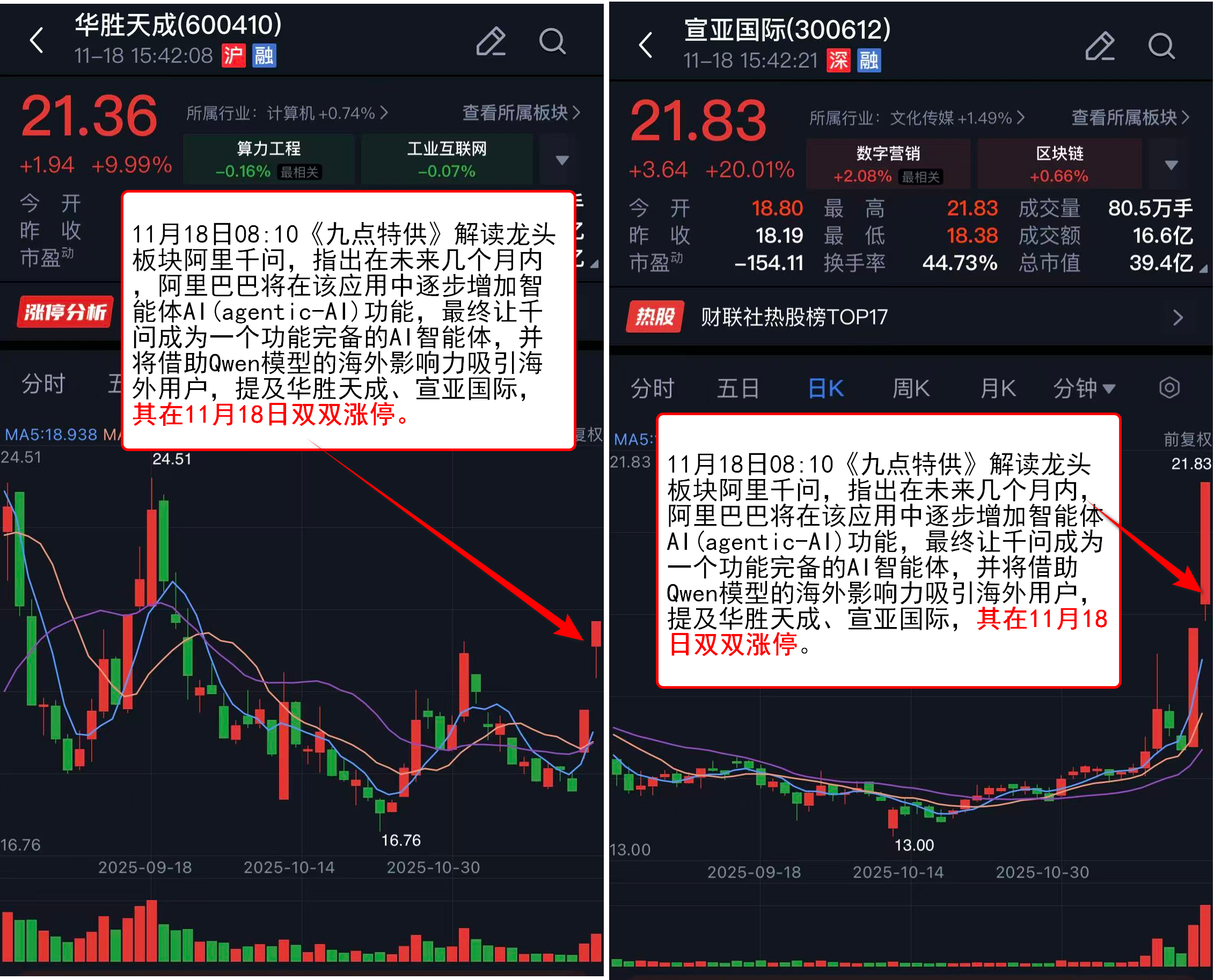 11月18日08:10《九点特供》解读龙头板块阿里千问,指出在未来几个月内,阿里巴巴将在该应用中逐步增加智能体AI(agentic-AI)功能,最终让千问成为一个功能完备的AI智能体,并将借助Qwen模型的海外影响力吸引海外用户,提及华胜天成、宣亚国际,其在11月18日双双涨停。
