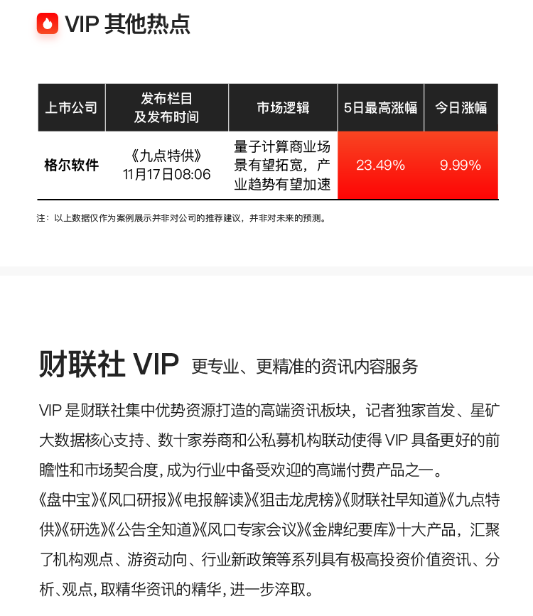 注:财联社VIP为内容资讯产品,并非投资建议。以下内容仅为资讯价值展示非对相关公司的推荐建议,非未来走势预测。投资有风险,入市需谨慎。