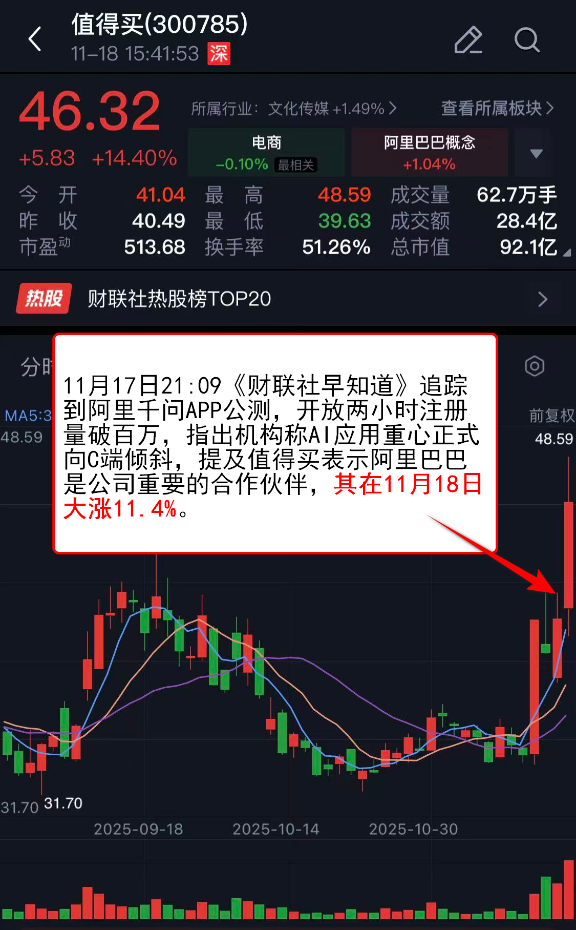 11月17日21:09《财联社早知道》追踪到阿里千问APP公测,开放两小时注册量破百万,指出机构称AI应用重心正式向C端倾斜,提及值得买表示阿里巴巴是公司重要的合作伙伴,其在11月18日大涨11.4%。
