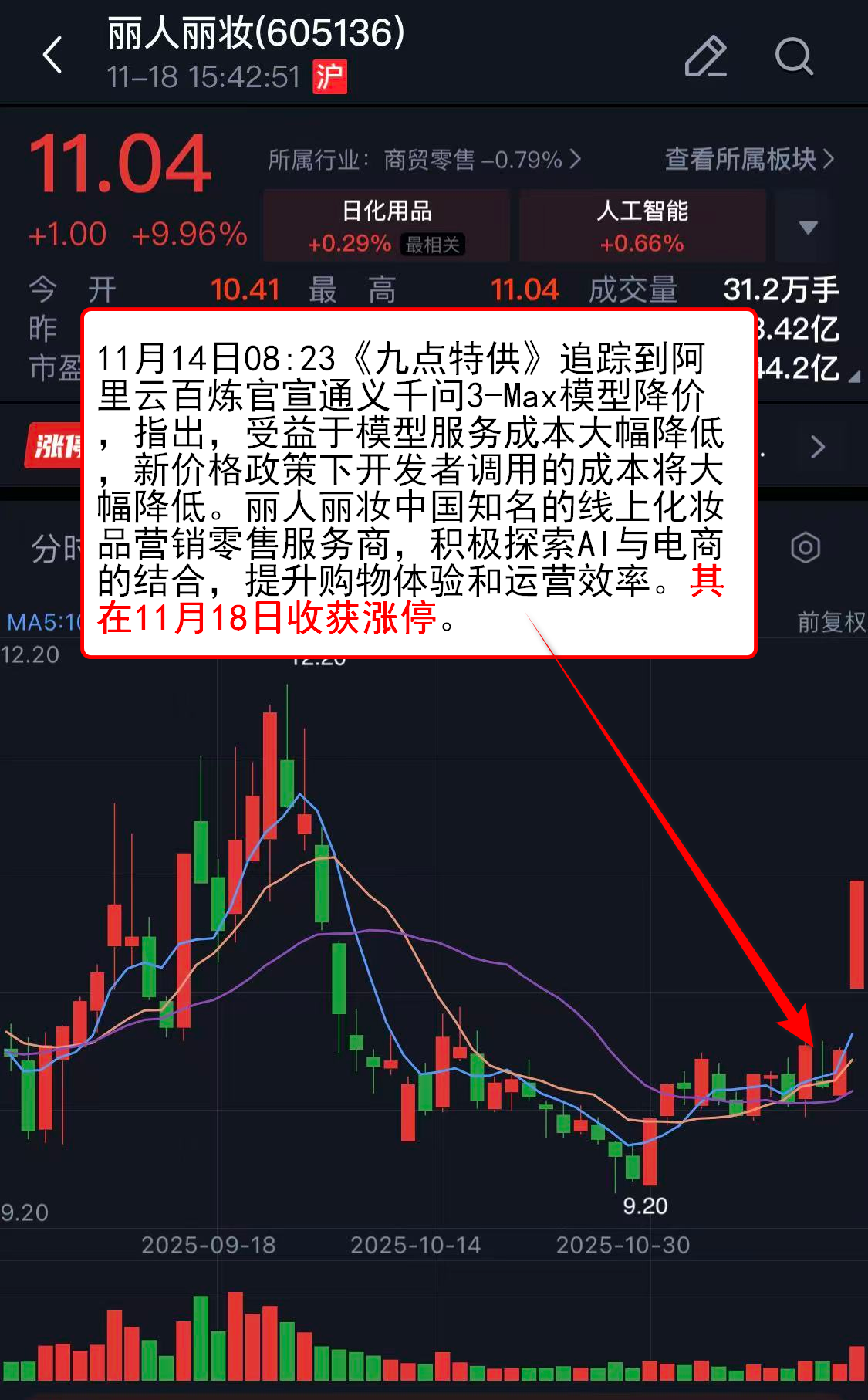 11月14日08:23《九点特供》追踪到阿里云百炼官宣通义千问3-Max模型降价,指出,受益于模型服务成本大幅降低,新价格政策下开发者调用的成本将大幅降低。丽人丽妆中国知名的线上化妆品营销零售服务商,积极探索AI与电商的结合,提升购物体验和运营效率。其在11月18日收获涨停。
