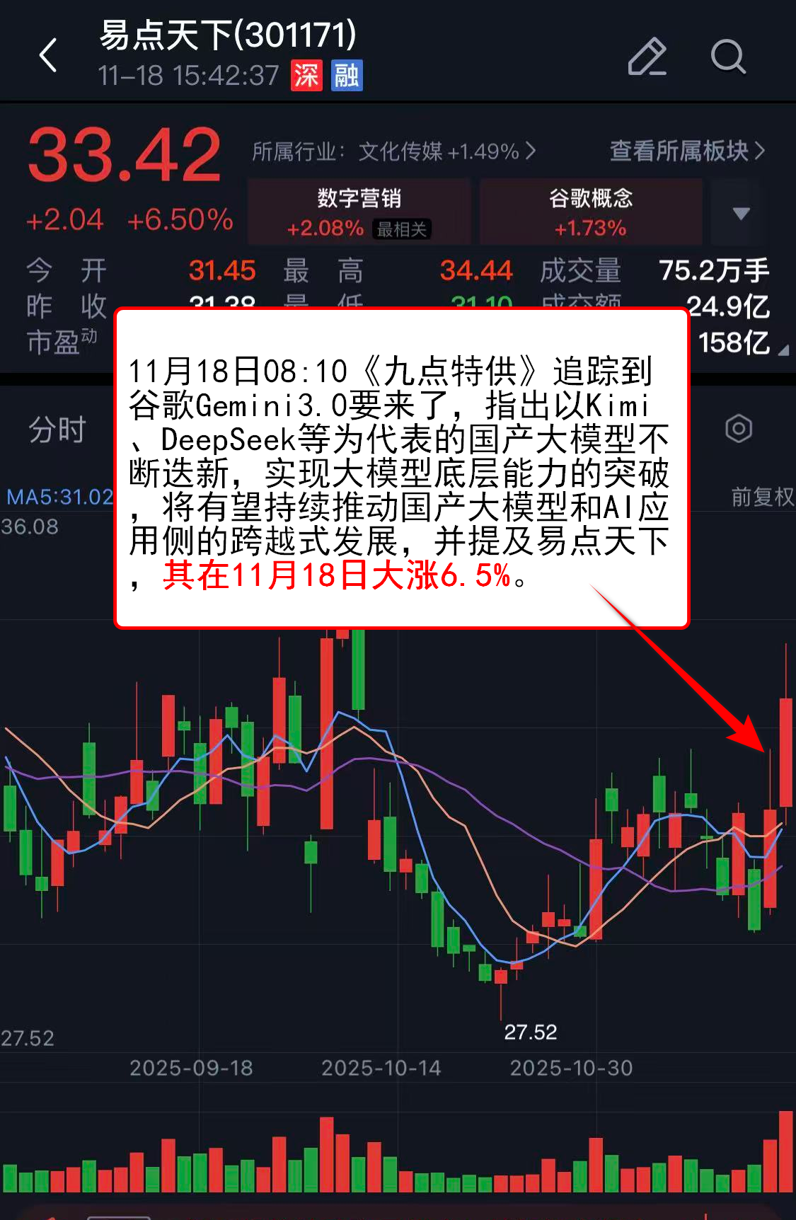 11月18日08:10《九点特供》追踪到谷歌Gemini3.0要来了,指出以Kimi、DeepSeek等为代表的国产大模型不断迭新,实现大模型底层能力的突破,将有望持续推动国产大模型和AI应用侧的跨越式发展,并提及易点天下,其在11月18日大涨6.5%。