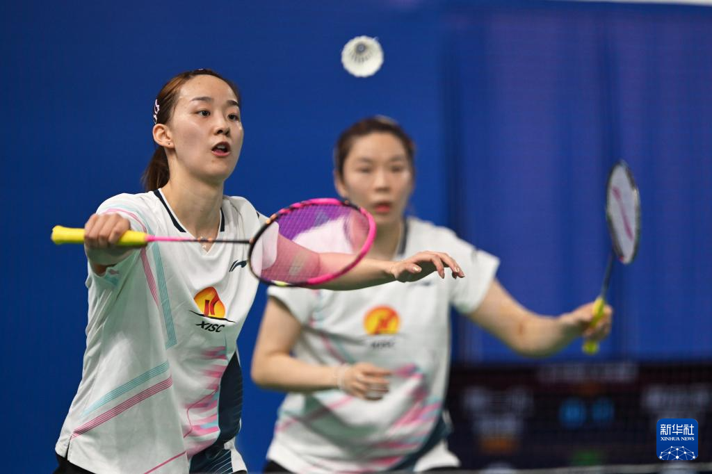 11月18日,湖南队组合贾一凡(左)/张驰在比赛中回球。