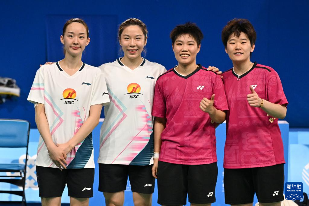 11月18日,福建队组合黄东萍(右二)/谭宁(右一)和湖南队组合贾一凡(左二)/张驰在比赛后合影。