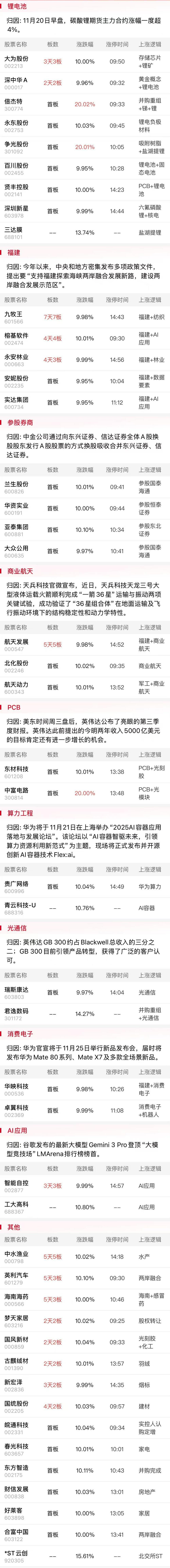 11月20日早盘,碳酸锂主力合约一度涨至10.22万元/吨,自6月份 5.99万元/吨的年内低点至今累计上涨56%。锂矿股早盘再度大面积冲高,大为股份录得3连板,大中矿业反包向上触及涨停,均创出历史新高,威领股份、盛新锂能一度触及涨停,盐湖提锂概念争光股份、三达膜等展开凌厉补涨。回顾锂电池产业链上一波主升行情,作为最上游的锂矿股仍是最后见顶环节,且盐湖提锂方向的补涨也处于锂矿股行情的末端。结合此前一度走出强势逼空行情的电解液方向华盛锂电、天际股份等人气品种持续回落出现破位行情,锂电龙头宁德时代H股盘中一度跌近9%,或预示着整个锂电产业链的阶段主升行情告一段落。
