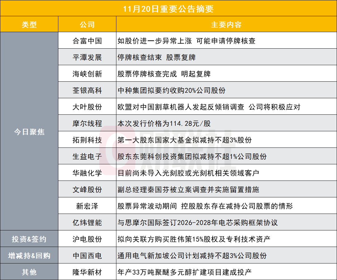 海峡创新(300300.SZ)公告,此前披露,公司股票自2025年10月27日至11月17日价格涨幅为185.89%,为维护投资者利益,公司申请股票停牌核查。经核查,公司前期披露的信息无误,近期公共传媒未报道可能影响股价的重大信息,公司经营正常,内外部环境未变,控股股东及实际控制人无应披露而未披露的重大事项。公司股票将于2025年11月21日复牌。