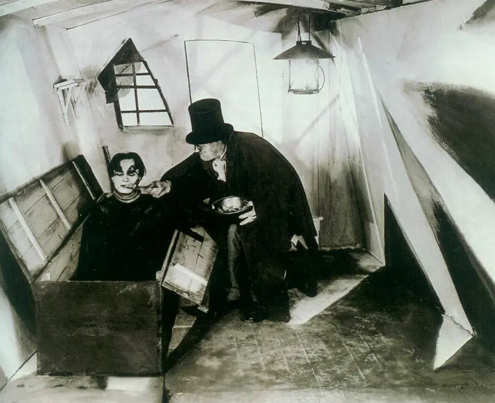 邱默云被拷打的房间,鲜明的光影布置,恰似德国表现主义的经典《卡里加里博士的小屋》。