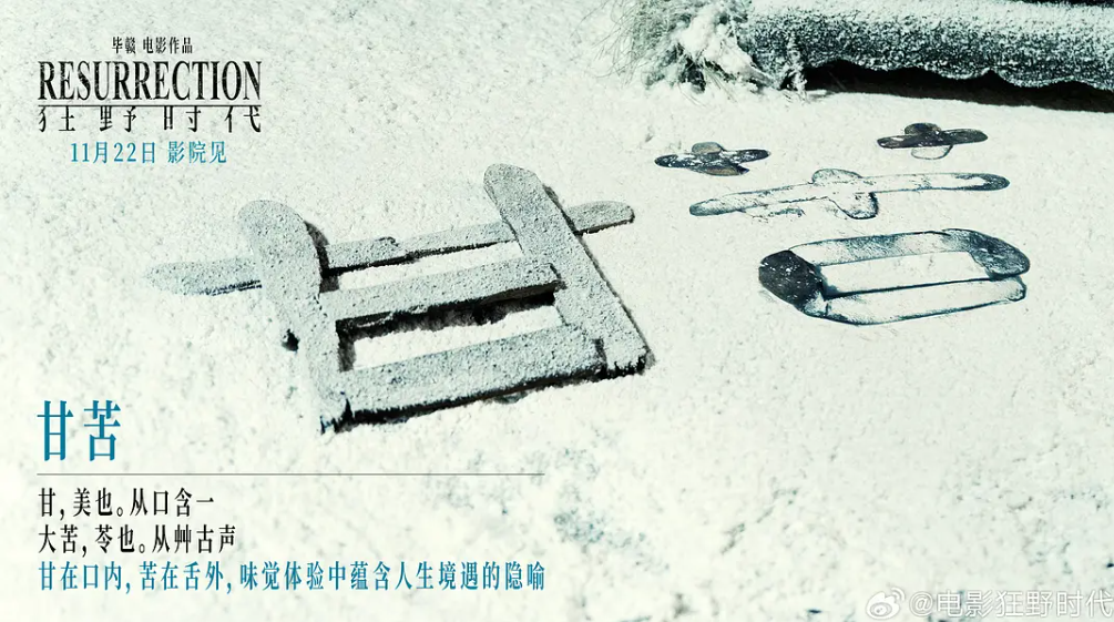 总之,我们看到电影中“甘”“苦”两个字,要么写在白雪上,要么写在水面划开的浮萍上——
