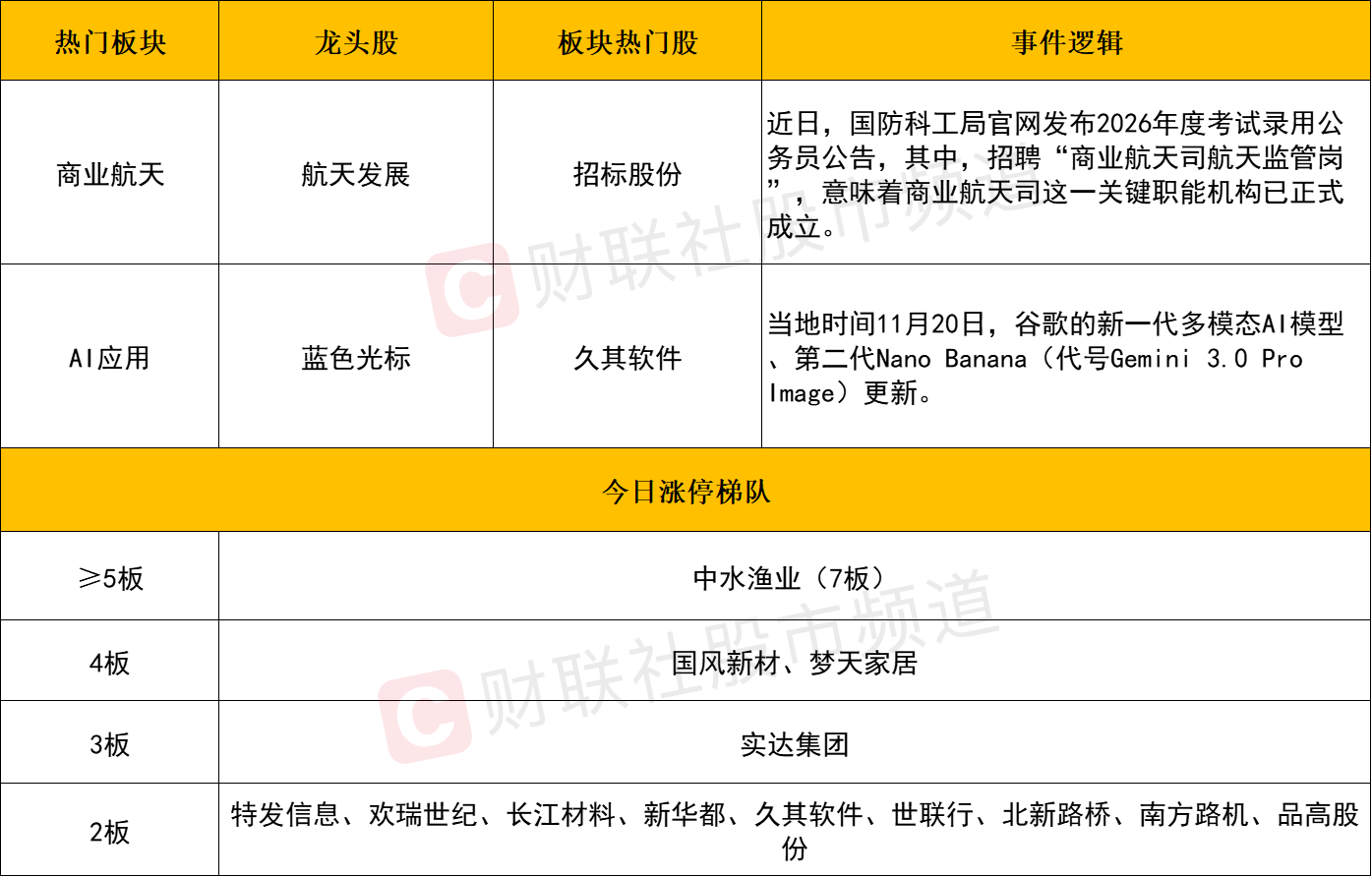 商业航天同样涨幅居前,招标股份、航天环宇、国机精工、上海港湾、中天火箭、航天动力等个股涨停。