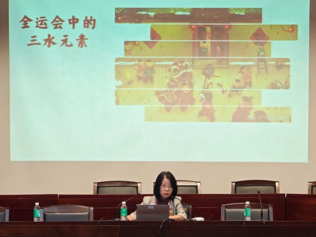 课堂上,李老师以“广府文化与三水特色”为核心,开场便通过趣味拍掌互动迅速破冰,让现场氛围暖意融融。“想懂三水,得先看清广府文化的根。”讲座伊始,李日红老师从地域版图切入,清晰梳理岭南文化与广府文化的从属脉络,将厚重的广府文化拆解为一个个可感可知的生活片段。谈及三水本土,李老师的讲述更添温情——以刚落幕的全运会为切入点,带领大家解锁城市的文化活力:开幕式上,三水籍粤剧名家曾小敏与汪明荃等艺术家联袂演绎《彩云追月》,让交响乐与粤剧唱腔碰撞出传统新声;三水中学校友汪粤的朗诵清亮有力,尽显三水青年精气神;三水籍艺人钱嘉乐与“大湾区哥哥”合唱的《海阔天空》,更是点燃全场热情。全运会宣传片《狮跃东方》中,芦苞长岐古村的卢氏大宗祠、600年岭南建筑风貌与超标准的长寿老人比例,勾勒出“明星古村”的烟火气息;乐平镇90后手艺人卢锦盛的狮头扎作技艺,让大家见证了三水非遗的年轻传承。李老师还提及,三水拥有百年足球史,云秀山体育场、健力宝足球青训中心里,藏着这座城市滚烫的体育热情,而落地三水的全运会群众足球赛事,更让这份热爱有了鲜活载体。