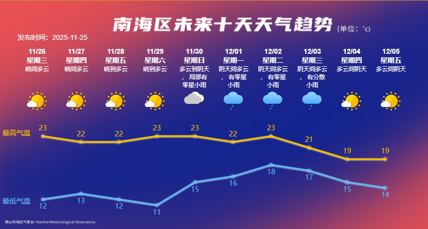 据南海区气象台预计,11月26日至29日冷空气影响频繁,昼夜温差较大,早晚寒凉,晴间多云为主,其中11月28日至29日受晴空辐射影响,早晨最低气温11℃左右;11月30日至12月2日转受偏南暖湿气流影响,云量增多,偶有零星小雨;展望12月3日至5日受新一股冷空气和切变线影响,有分散小雨,气温下降。