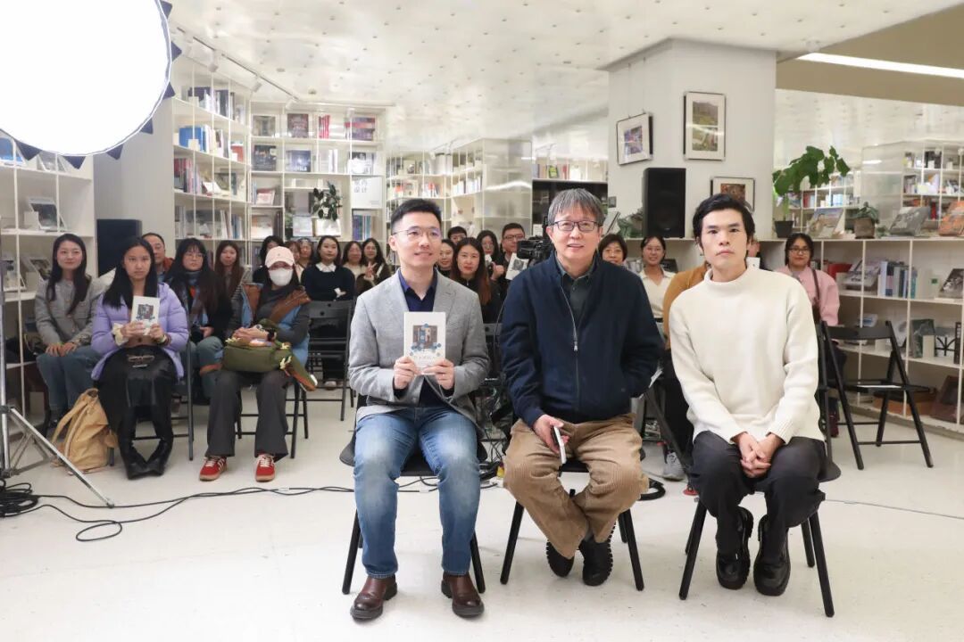 ▲2025年11月2日,在Page One书店北京坊店的新书对谈活动上,邵栋(左)、赵稀方(中)、吴呈杰(右)和读者合影 图/人民文学出版社提供