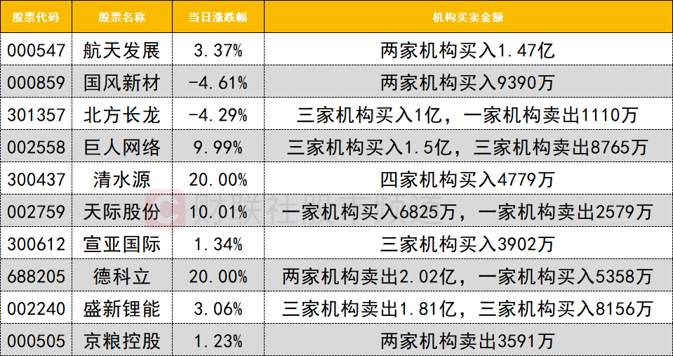 今日龙虎榜机构活跃度较高,买入方面,航天发展获两家机构买入1.47亿。国风新材获两家机构买入9390万。巨人网络今日涨停,获三家机构买入1.5亿,同时遭三家机构卖出8765万,深股通卖出2.88亿。