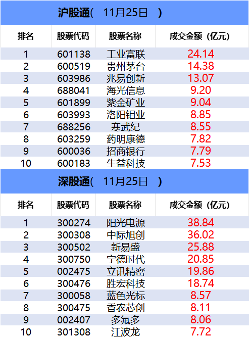 从沪股通前十大成交个股来看,工业富联位居首位;贵州茅台和兆易创新分居二、三位。