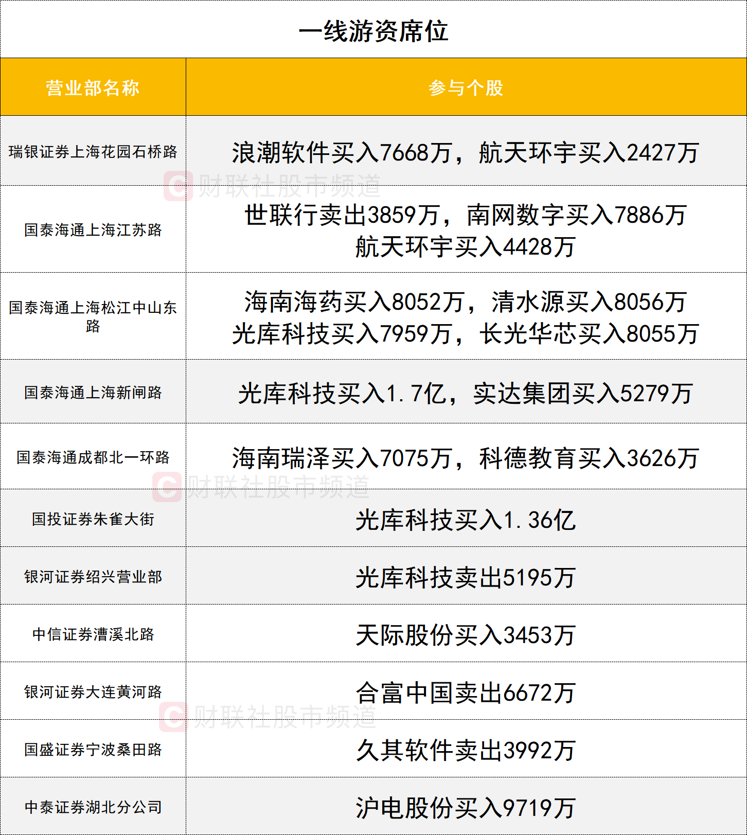 一线游资活跃度较高,光库科技今日20cm涨停,获三家一线游资席位(国泰海通证券上海新闸路、国投证券西安朱雀大街、国泰海通证券上海中山东路)合计买入3.85亿。