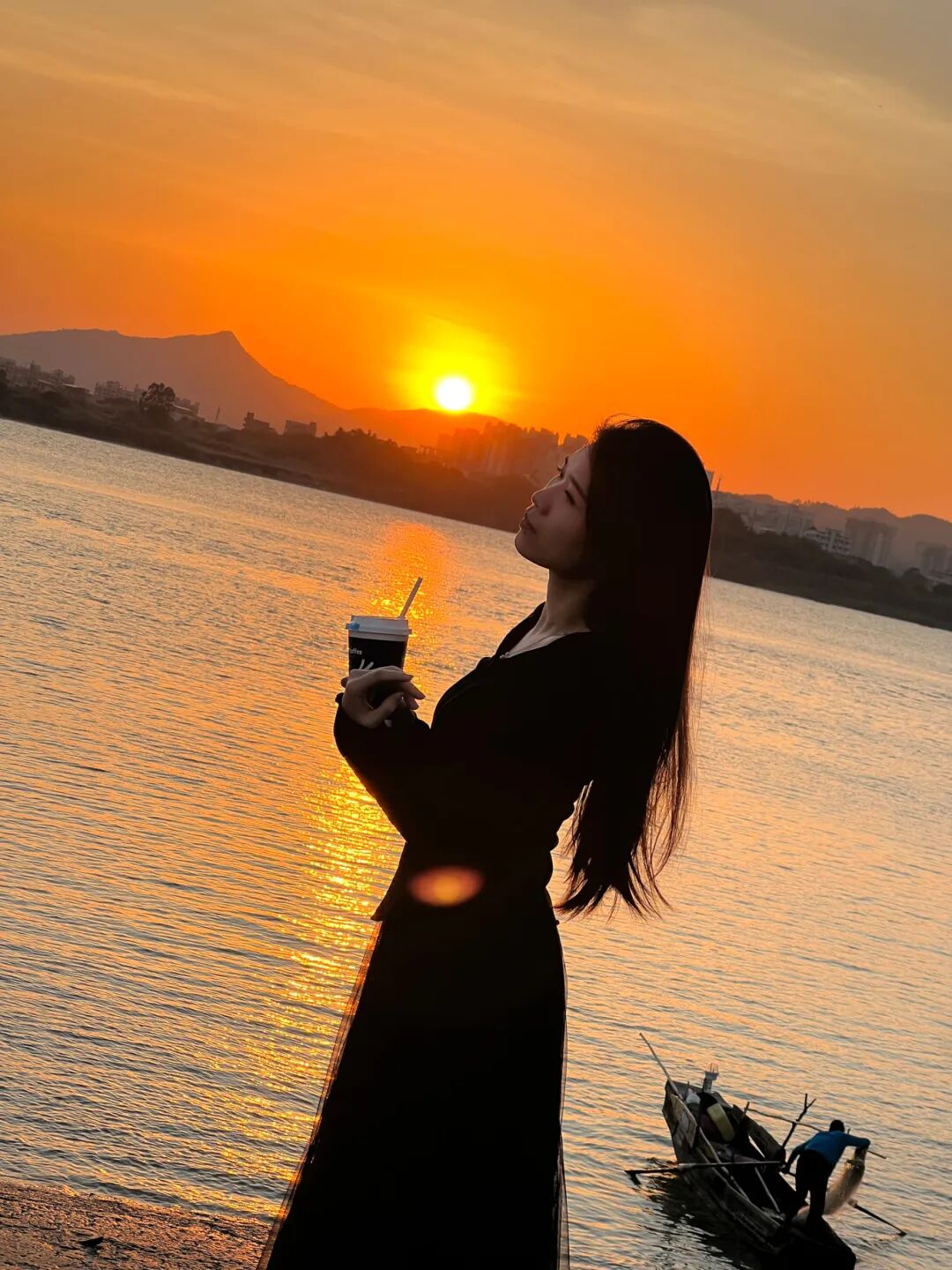 夕阳、渔船与