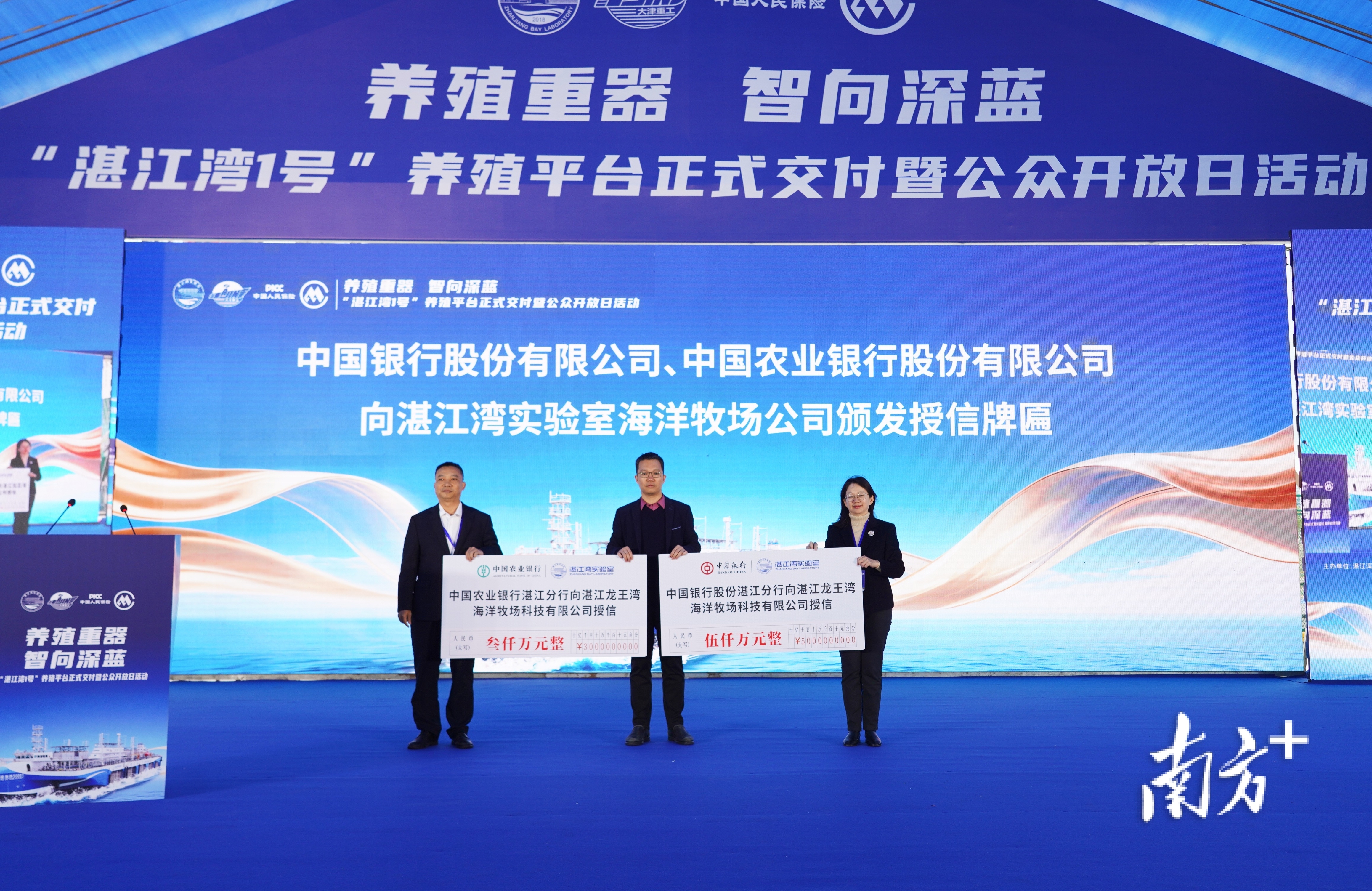 金融活水,精准滴灌。在交付当天,中国银行湛江分行和中国农业银行分别为“湛江湾1号”运营主体湛江龙王湾海洋牧场科技有限公司提供5000万元和3000万元授信,湛江农商银行此前已提供3000万元授信,为“湛江湾1号”的后续运营注入了强劲的金融动力。