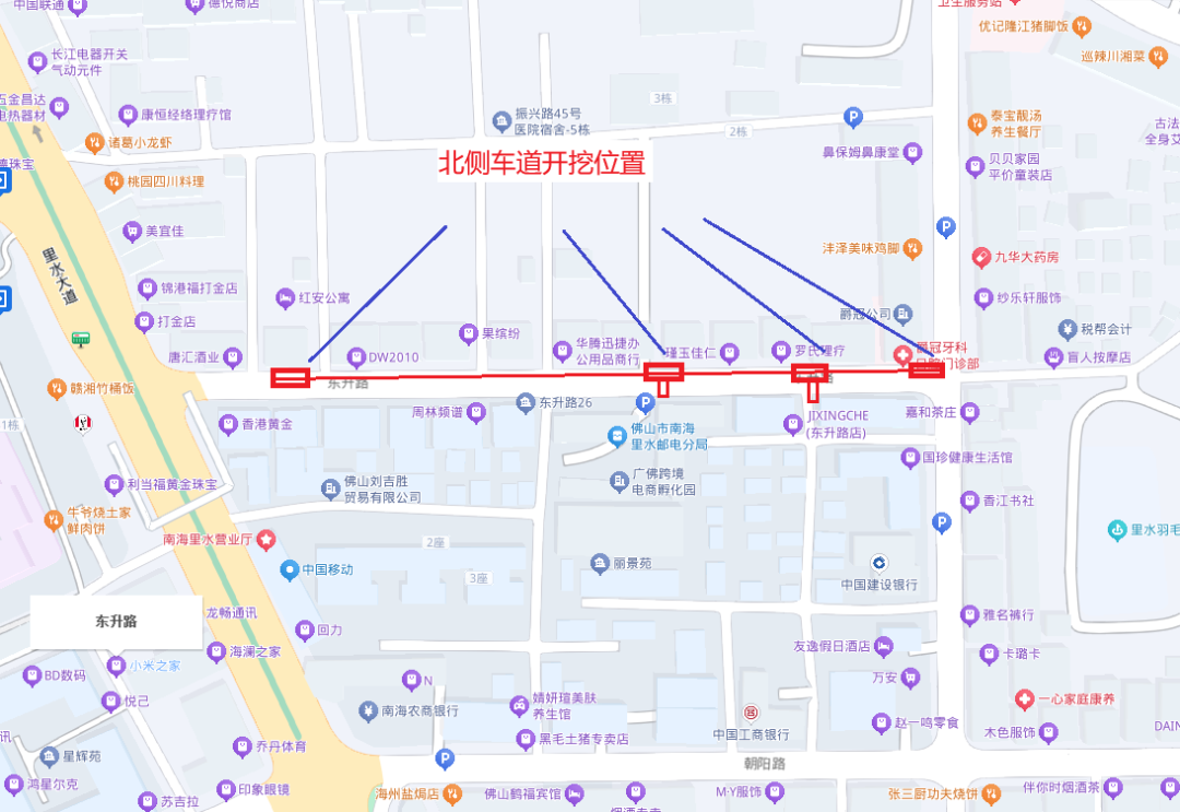 施工期间,将对东升路北侧车道和振兴路西侧车道局部区域进行围挡作业,保留单车道双向通行(具体围挡范围详见现场示意图)。请过往小型车辆减速慢行,注意避让施工区域及人员;建议市民尽量选择绕行路线,减少通行延误。