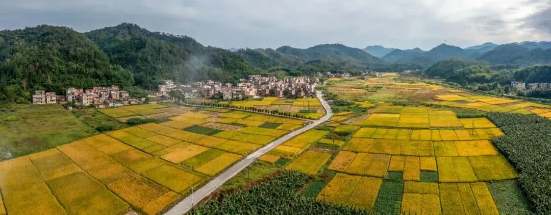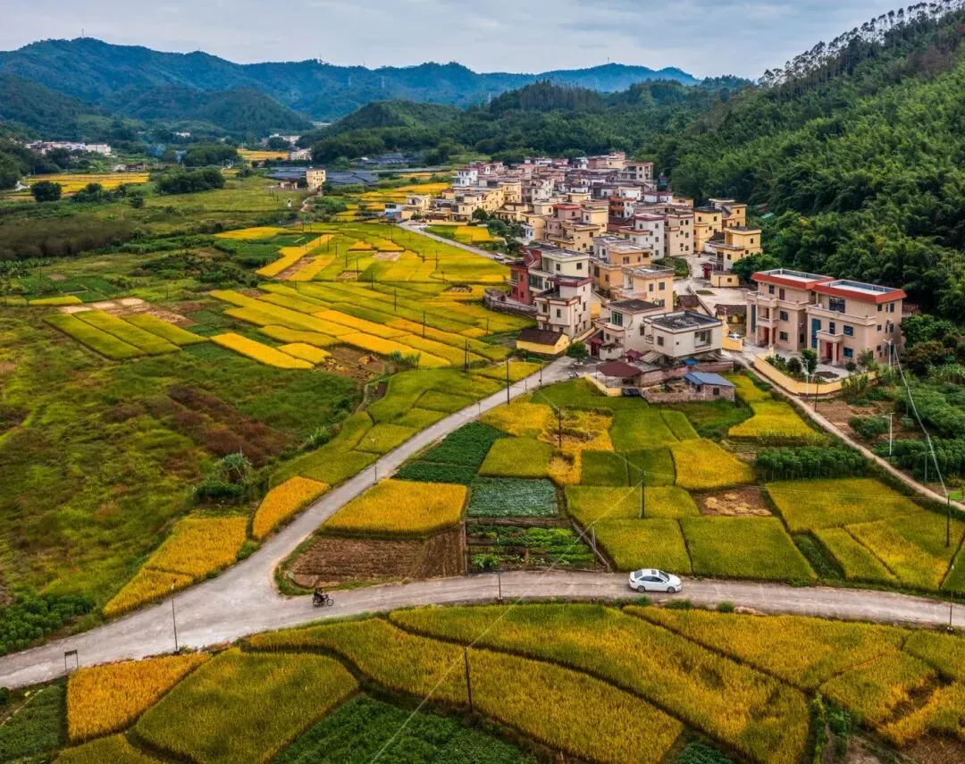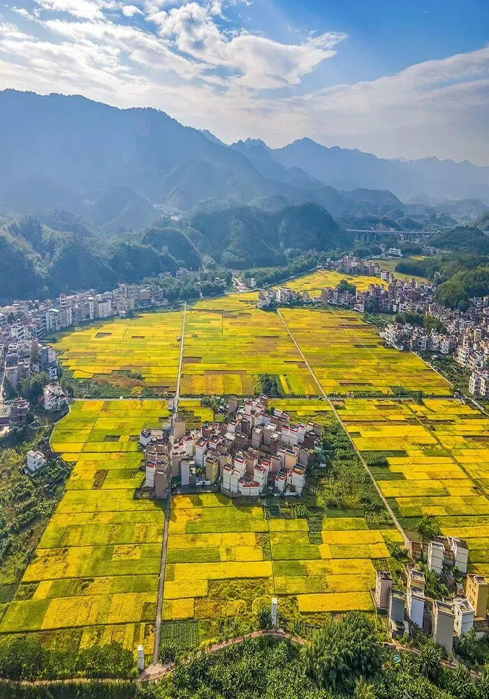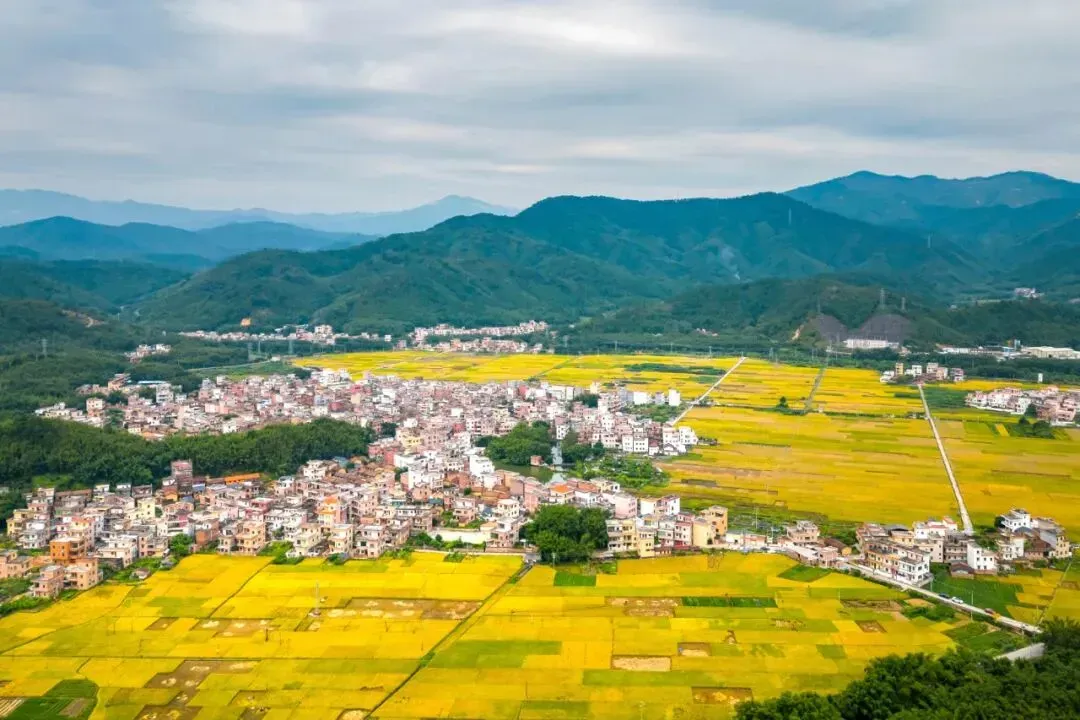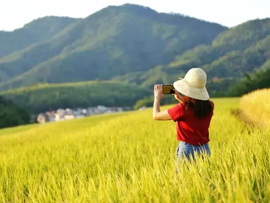 山脚下的稻田翻涌着金浪,