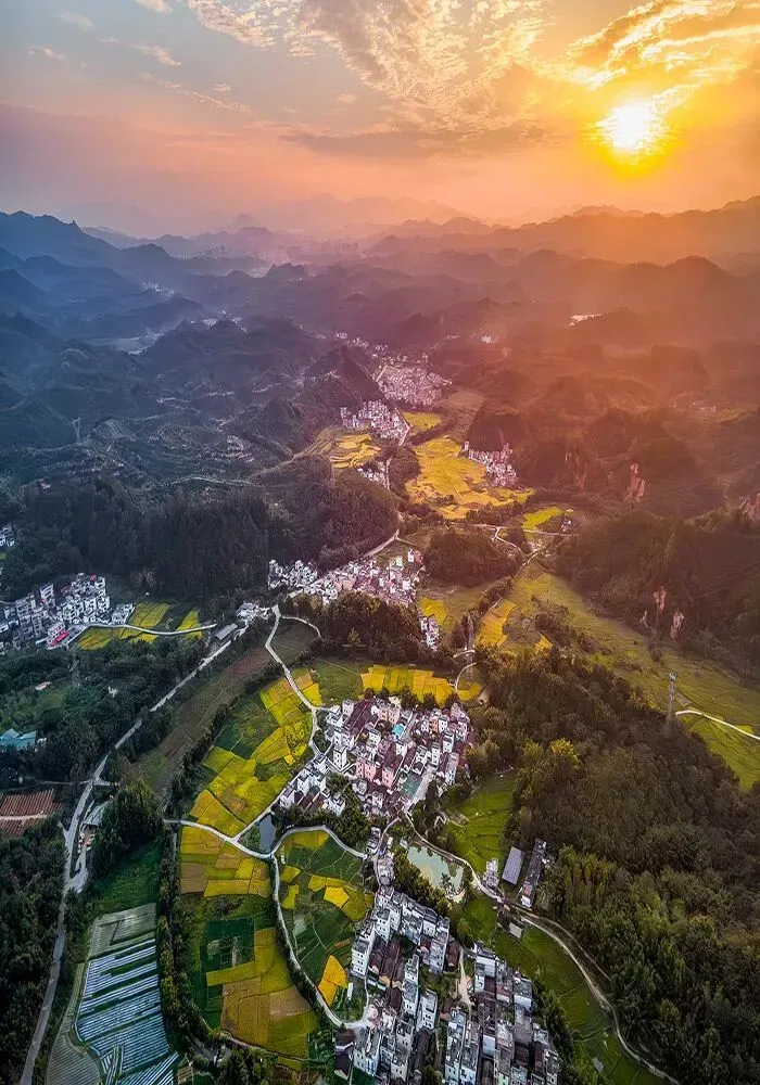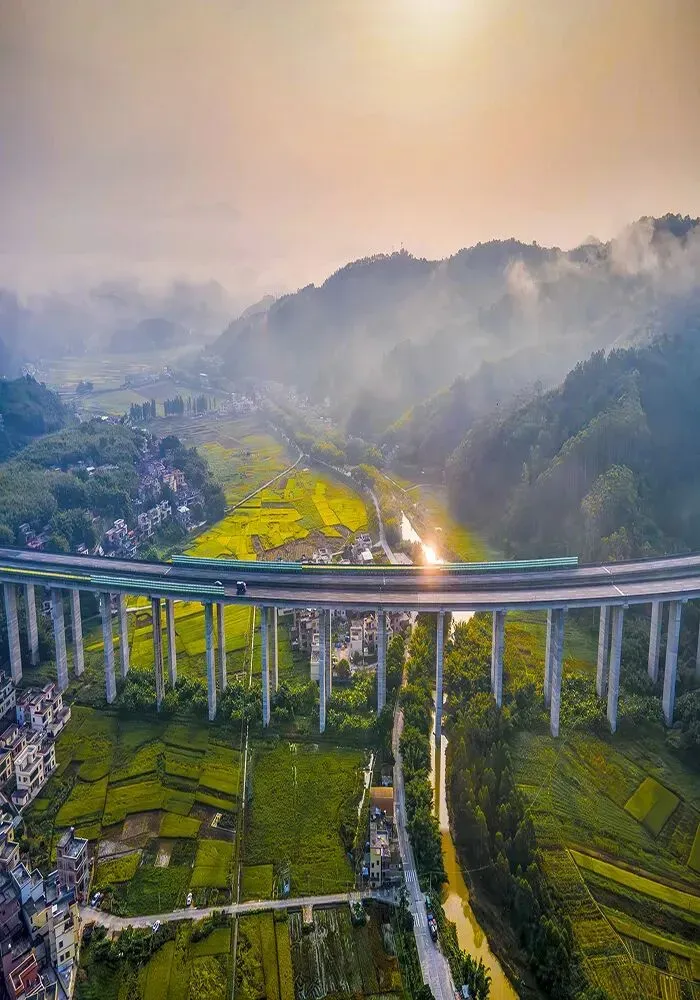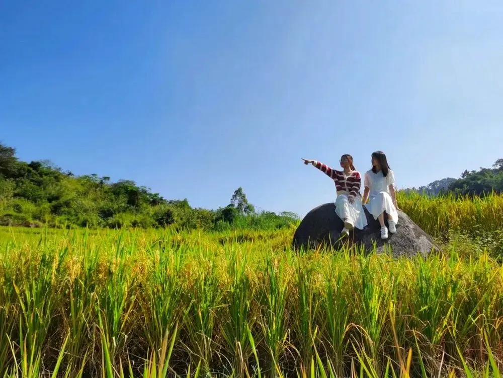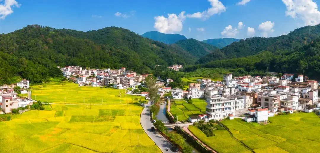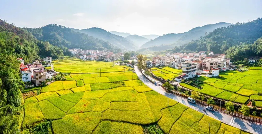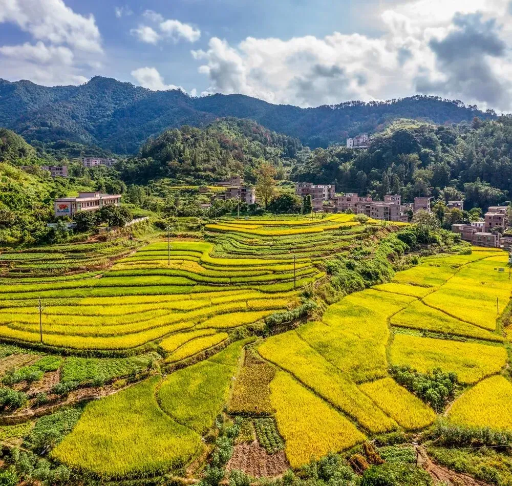 山脚下的稻田翻涌着金浪,
