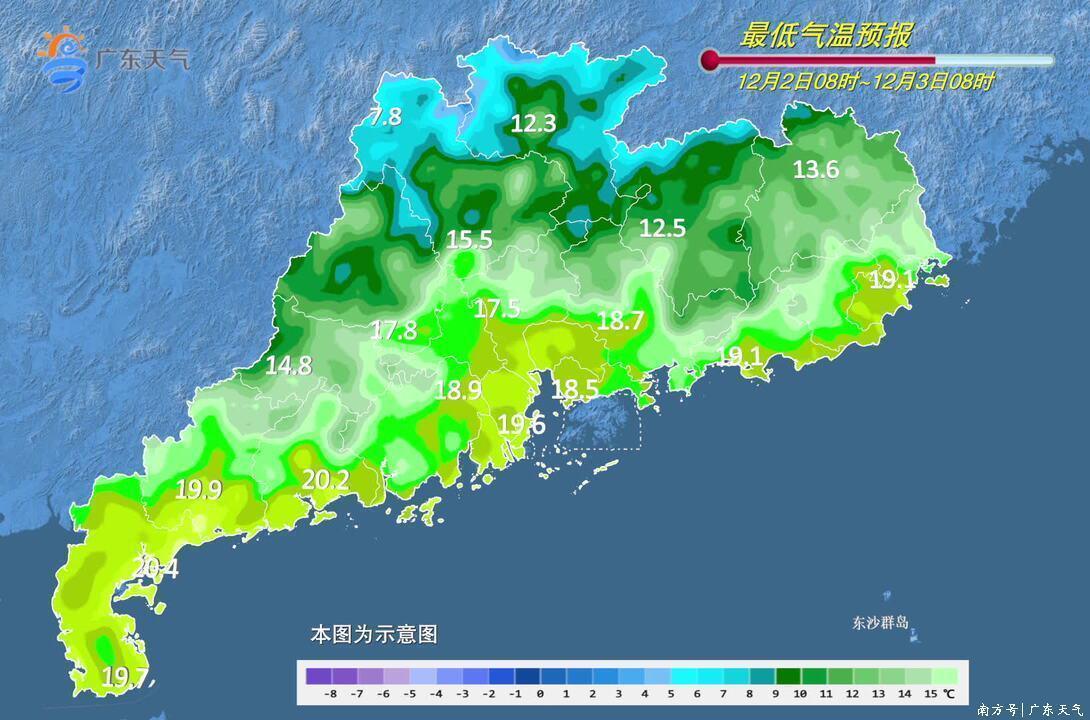 12月1-2日白天,粤西和珠三角南部市县阴天间多云,有分散零星小雨,其余市县多云到阴天,局部有小雨。最低气温:粤北、珠三角北部和粤东北部市县10~16℃,南部沿海市县18~21℃,其余市县16~18℃。