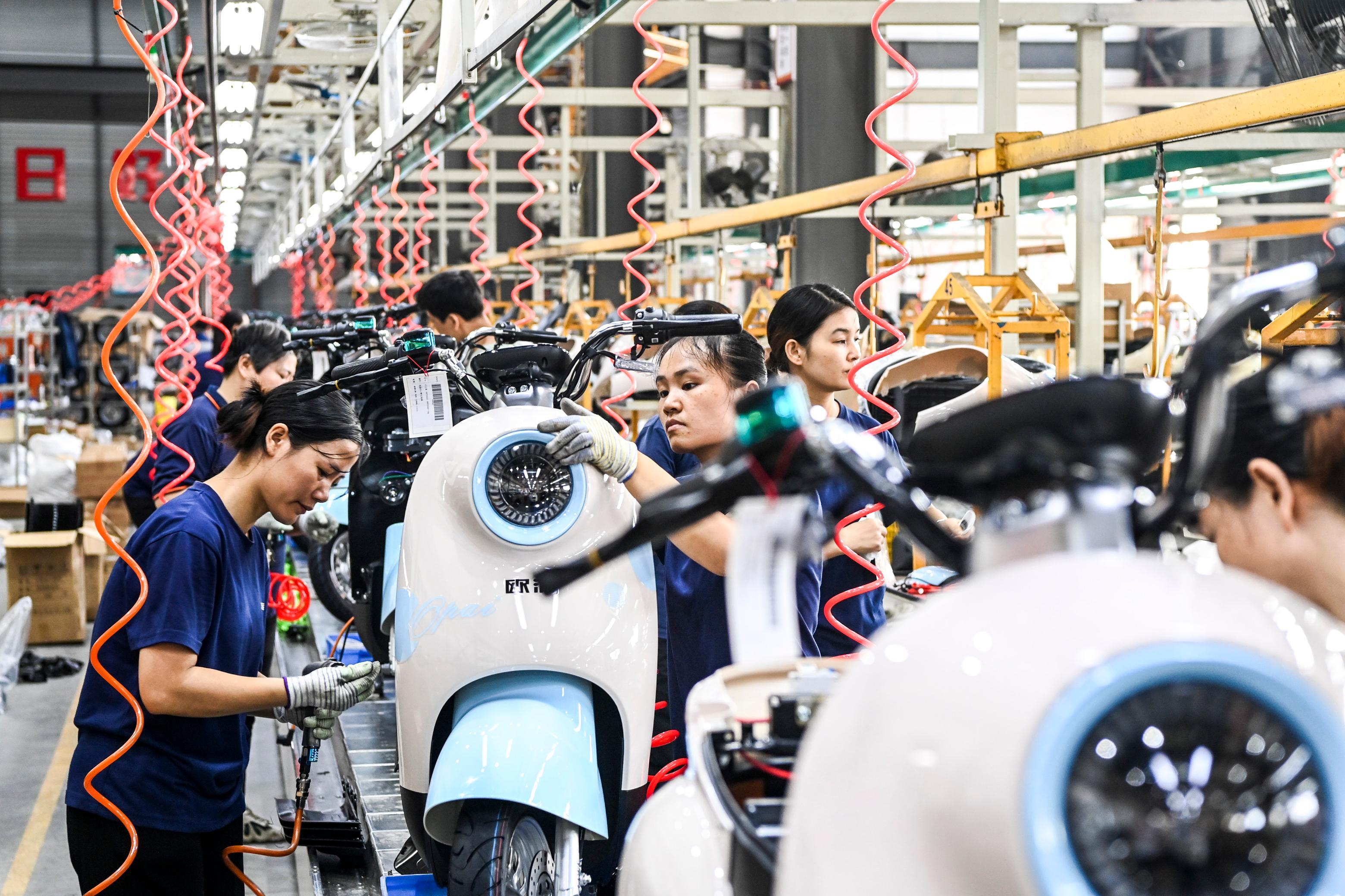 员工在贵港市港北区一家电动车生产企业内装配电动车。新华社图