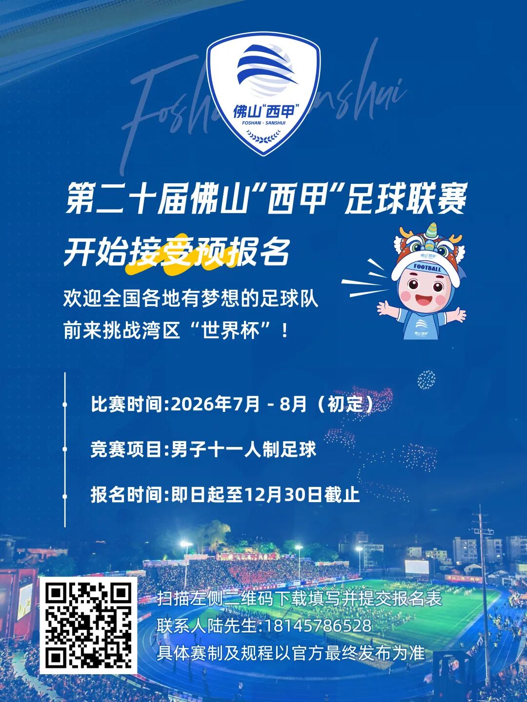 2026年第二十届佛山“西甲”足球联赛初定于2026年7月-8月举行,竞赛项目为男子十一人制足球,即日起至12月30日接受预报名。详情:三水发布