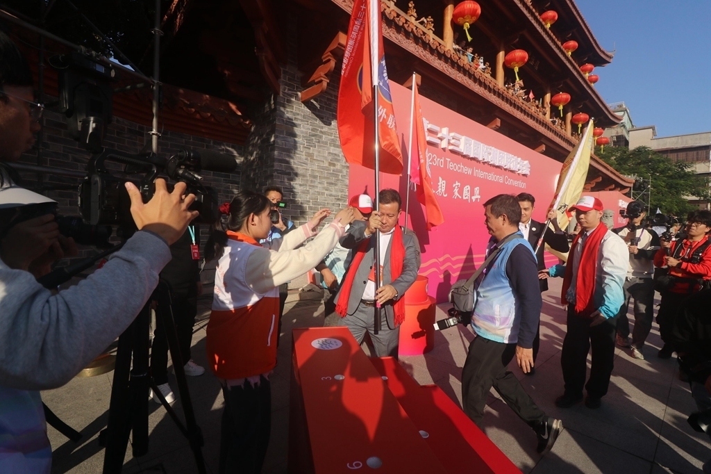其中,镇海楼广场的“薪火相传”环节,更是将归乡之情推向高潮。178面旗帜迎风飘扬,全球潮团代表将会旗汇聚成“潮州”字形,宛如全球潮人紧紧相拥。“根脉亲、家国兴!”三声口号铿锵有力,道出了所有潮人的肺腑之言。随后,潮团旗帜分批次插入旗座,犹如条条根脉深深扎进故乡的土壤,传承着潮人薪火不息的精神。美国南加州潮州会馆监事长吴林盛今年已73岁,这是他第一次回到潮州。他动情地说,“插旗那一刻,我真切感受到根在这里,一定要让下一代多回家看看!”