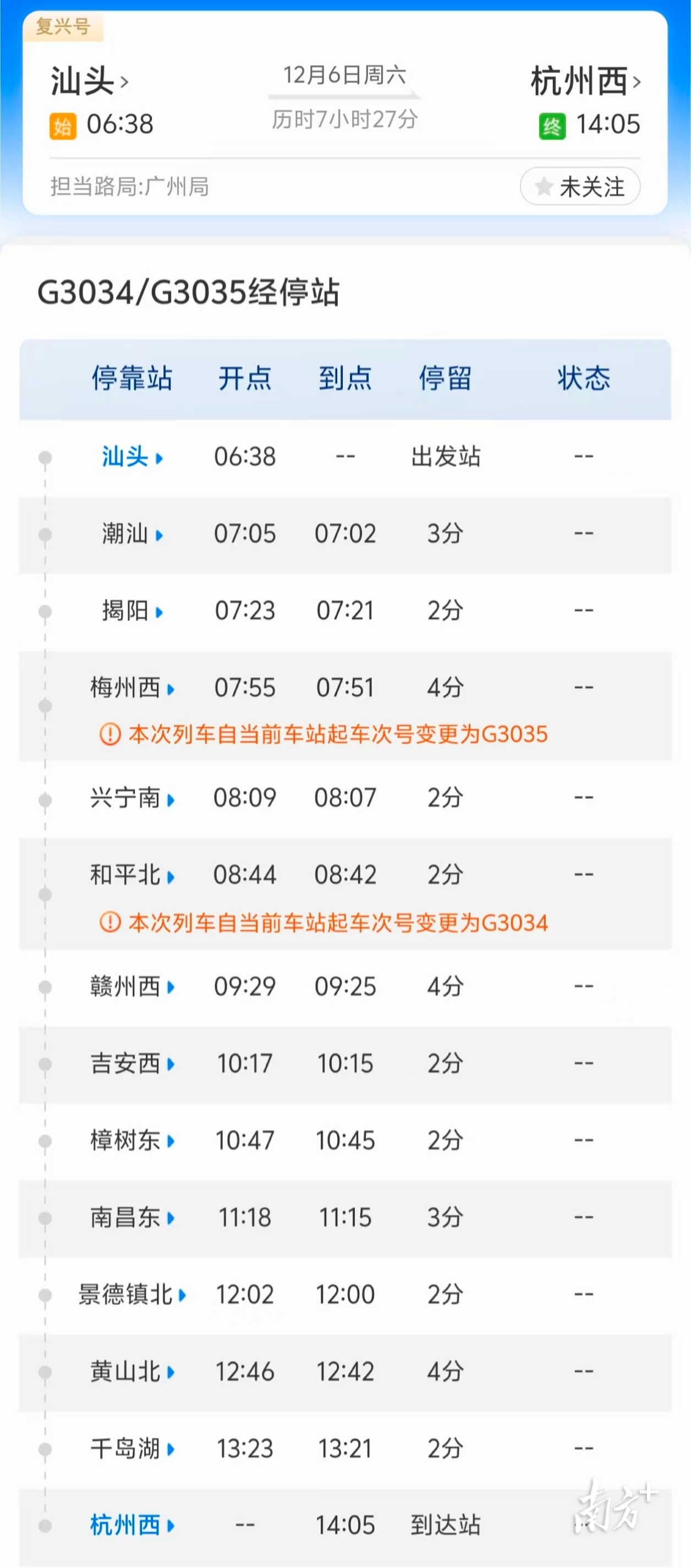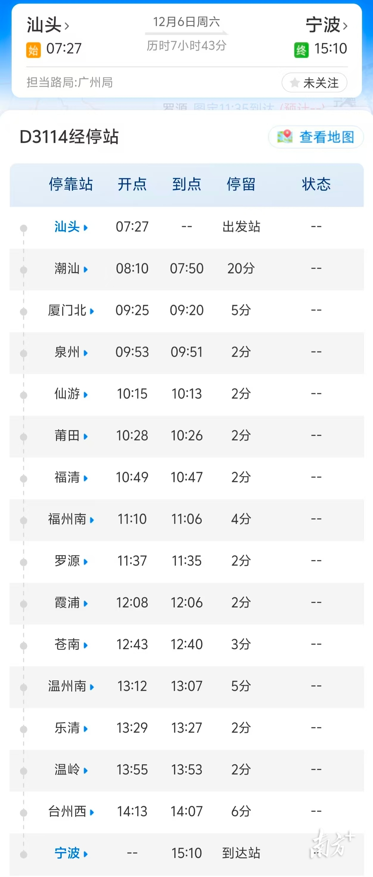据了解,此次新开行的动车组列车包括汕头至宁波D3114次(7:27开)、宁波至汕头D3113次(23:33到),以及汕头至杭州西G3034次(6:38开)、杭州西至汕头G3033次(22:42到),开行时间为2025年12月5日至2026年1月4日。12306平台即将开放购票渠道,有需要的市民可关注平台最新动态。