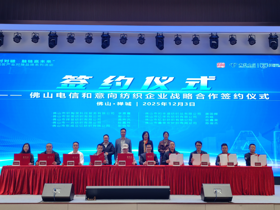 同时,中国电信佛山禅城区分公司与佛山市东成立亿纺织有限公司、佛山市一言纺织有限公司、佛山市钎陶里科技服务有限公司等约10家纺织企业举行了战略合作签约仪式,标志着中国电信“AI边织边检”解决方案在佛山纺织产业集群的规模化应用进入新阶段。