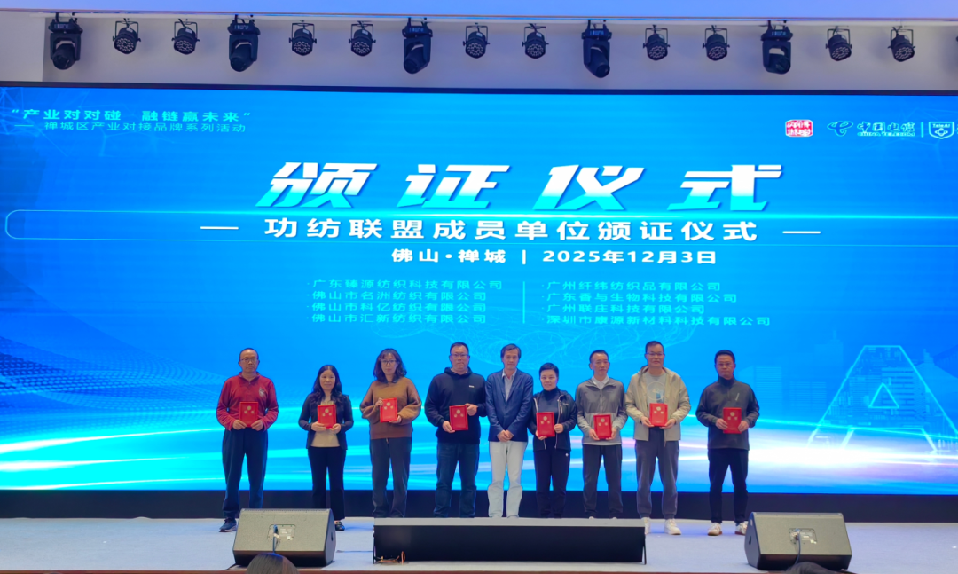 会上还举行了广东省纺织工程学会功能性纺织品技术创新联盟(功纺联盟)新成员授牌仪式。17家来自功能性材料研发、智能装备、生产制造、检测认证等环节的优质企业正式加入联盟。