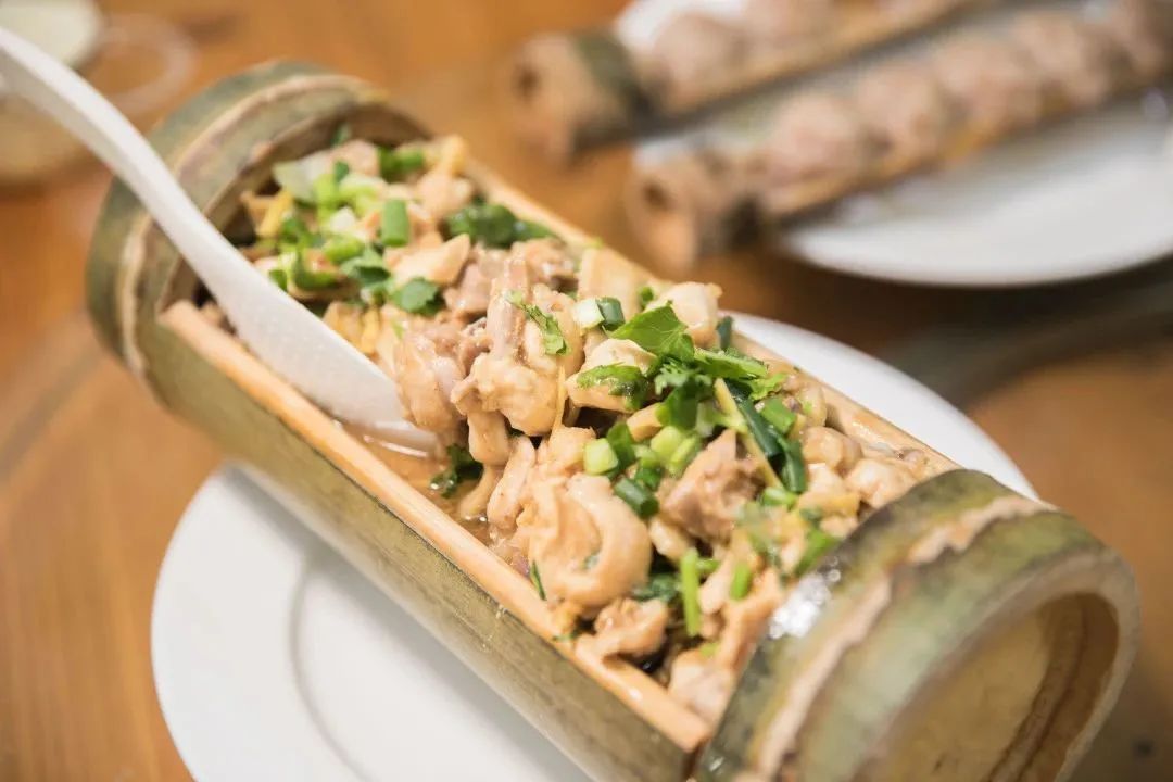 新鲜的竹子与米饭和鸡肉同蒸,清甜的米饭和竹子的清香渗入鸡肉里,一口下去嫩滑香甜,太绝了!