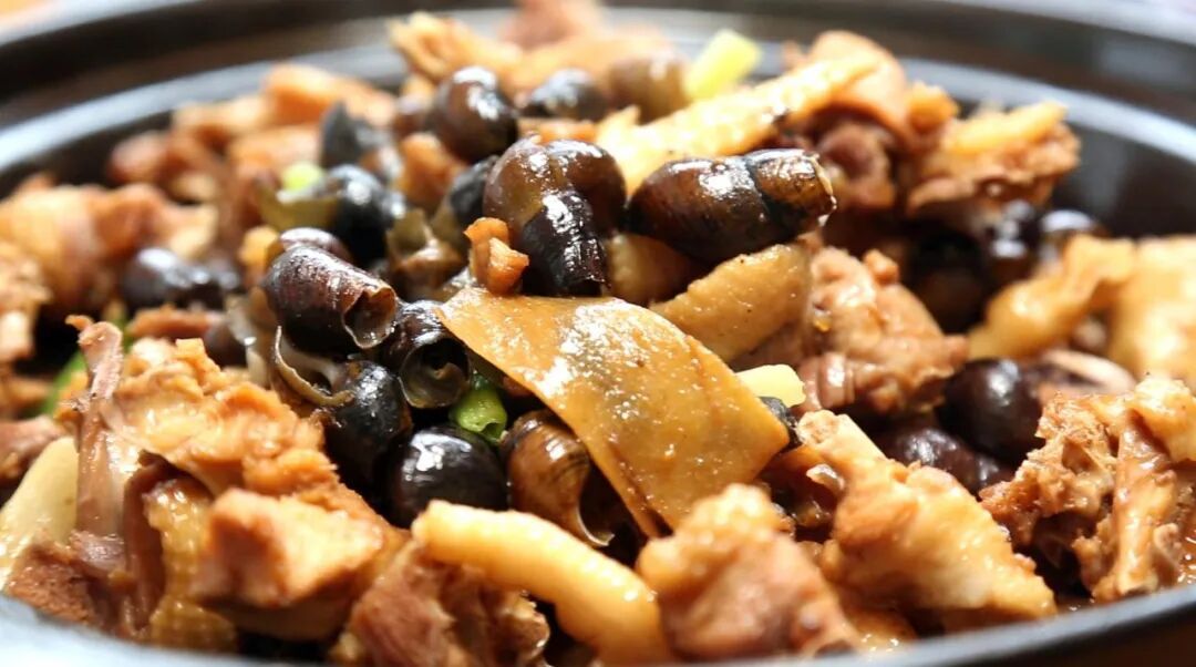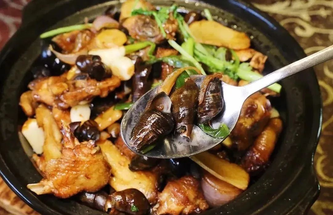 高温作用下,山坑螺的鲜味与鸡肉的香味充分融合,鲜味十足。胡须鸡肉厚雪白,嫩滑不腻,皮脆适口,味道鲜美,山坑螺肥美清甜。