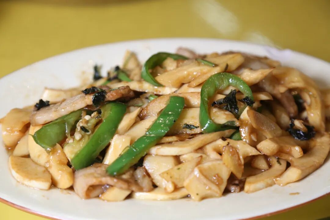 鲜春笋肉质爽脆,清香鲜美,五花肉煸炒过后香而不腻,春笋与五花肉搭配鲜香十足,爽脆可口。