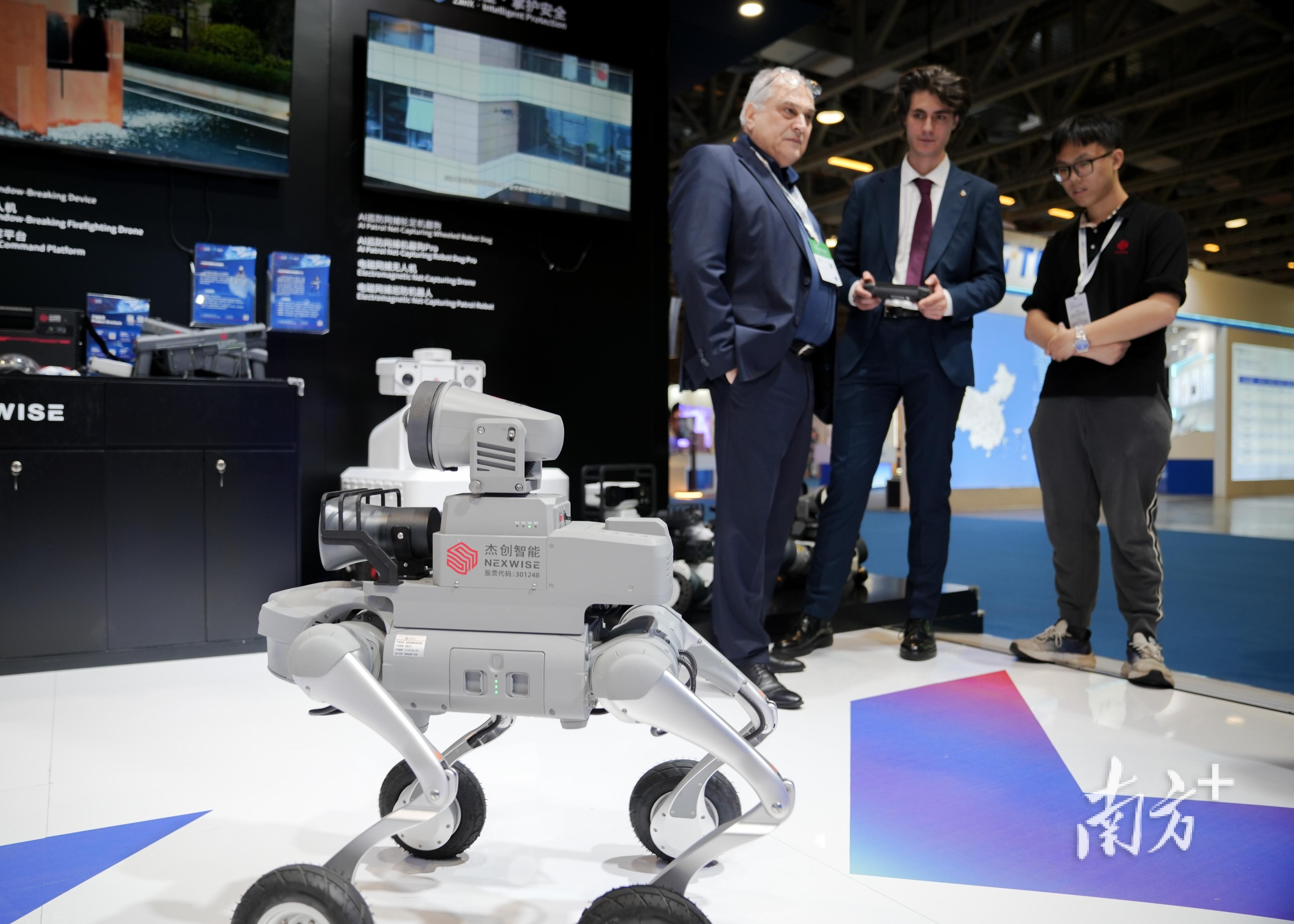 机器狗也不甘示弱,与洋客商实现“协同网捕”。“他们朝我开了一‘枪’!一张网瞬间把我罩住,完全无法动弹。这技术太秀了!”在杰创智能的展位上,俄罗斯采购商尼克·柴可夫斯基兴奋地体验了一款手持式电磁网捕器。罗马尼亚采购商马里安・科斯特亚是“抓捕者”,“它很安全也很人性化,相信在欧洲会有市场。”这款“黑科技”新品采用首创的电磁弹射技术,能发射两发特制的抓捕网,与使用者同行的机器狗也可以同步发射,实现精准网捕“三连击”。
