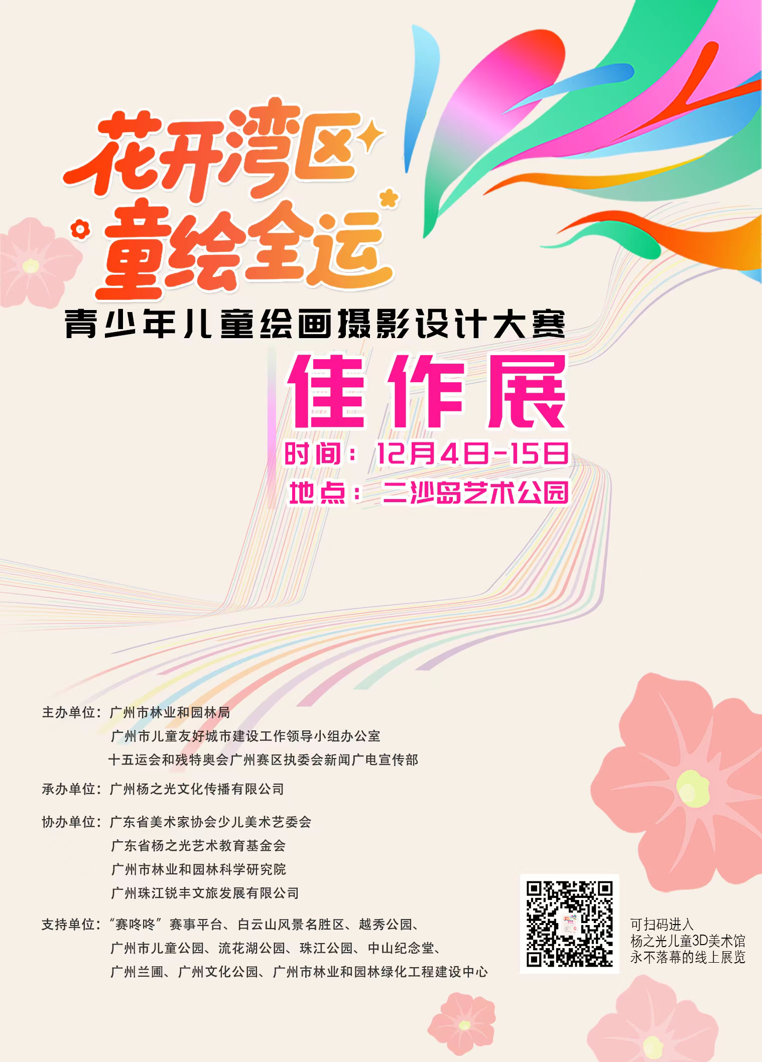 12月4日至15日,“花开湾区 童绘全运”大湾区青少年儿童绘画摄影设计大赛佳作展在二沙岛艺术公园户外绽放,为第32届广州园林博览会再添一抹鲜活的姹紫嫣红。