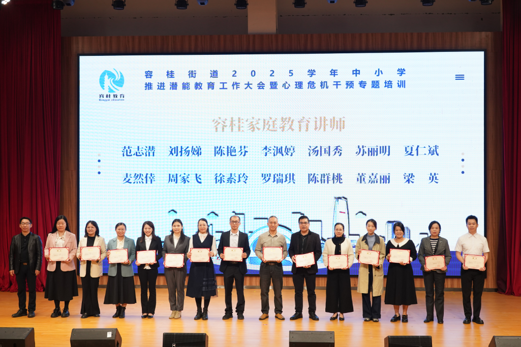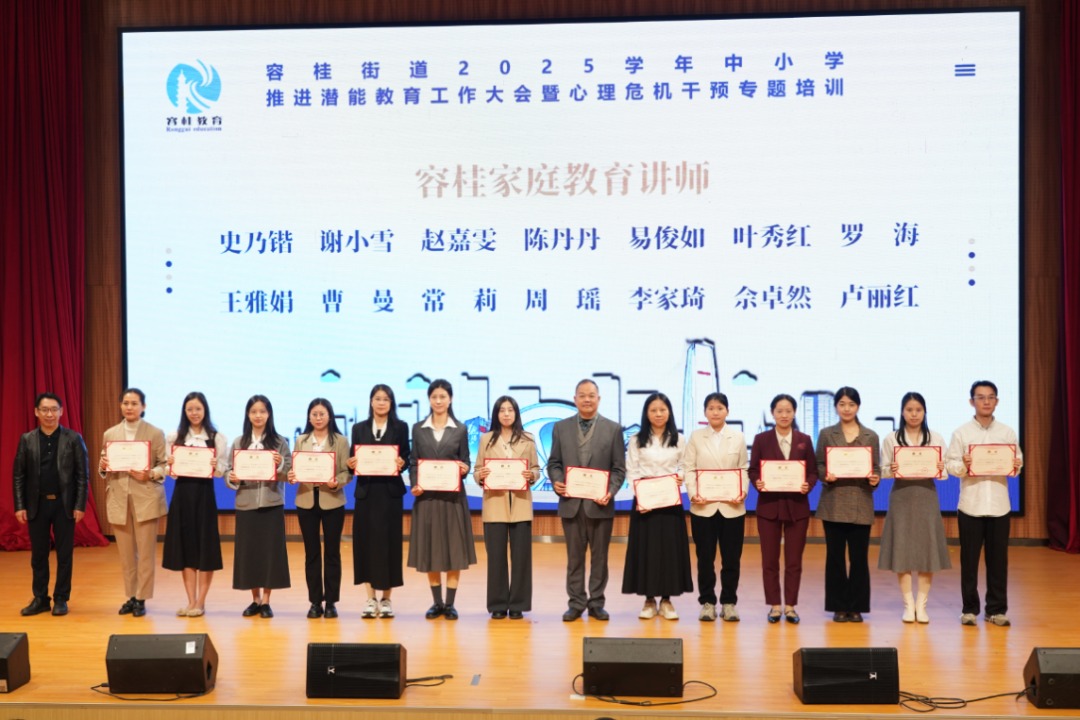 为将潜能教育理念落到实处,街道整合资源,新组建了三支专业指导队伍。容桂街道党工委委员陈永刚等现场为29名家庭教育讲师、8名心理健康教育指导教师和7名特殊教育巡回指导教师颁发聘书。这三支队伍将作为推进潜能教育的专业力量,深入各中小学开展宣讲、指导与帮扶工作,助力实现“一生一策”的个性化成长支持。