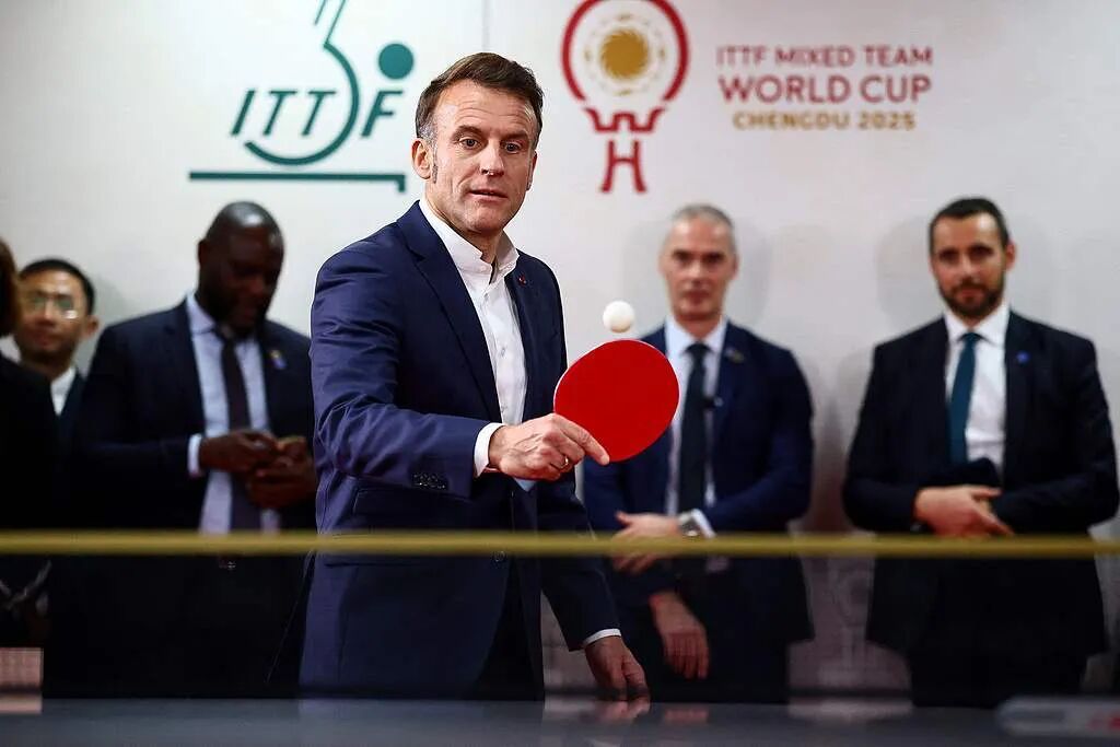 访问成都期间,马克龙还来到四川省体育馆看望参加混团世界杯比赛的法国乒乓球运动员,并与他们一起同中国乒乓球运动员王楚钦、孙颖莎、林诗栋等挥拍较量,与中国乒协主席王励勤进行互动。